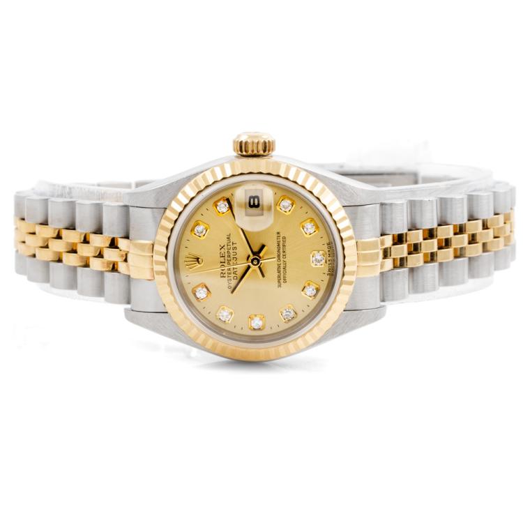 Rolex Oyster Perpetual Datejust 18ct yellow gold and stainless steel automatic ladies watch. Gold dial, Diamond indicators, date, case diameter: 26mm, wrist size: 16.5cm, Swiss made. Ref# 79173G. Circa: 1999. With Rolex two-tone Jubilee bracelet and clasp. With Certificate of Authenticity and Rolex box with Rolex gift bag. 3 month FSA warranty (Pre-owned)