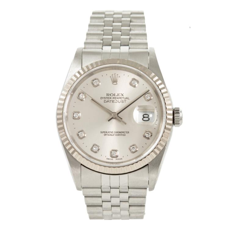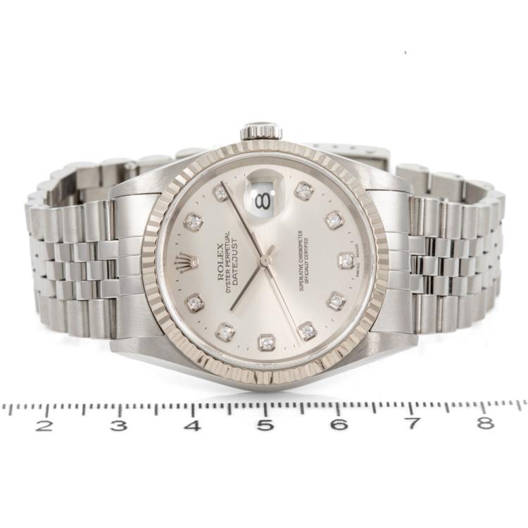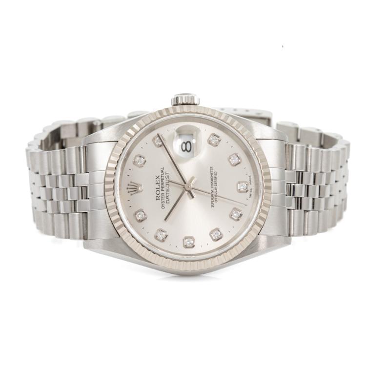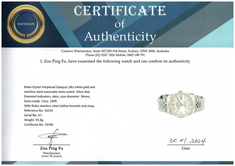 Rolex Oyster Perpetual Datejust 18ct white gold and stainless steel automatic mens watch. Silver dial, Diamond indicators, date, case diameter: 36mm, wrist size: 19cm, Swiss made. Ref# 16234G, Circa 1999. With Rolex stainless steel Jubilee bracelet and clasp. With Certificate of Authenticity and Rolex box. 3 month FSA warranty. (Pre-owned)