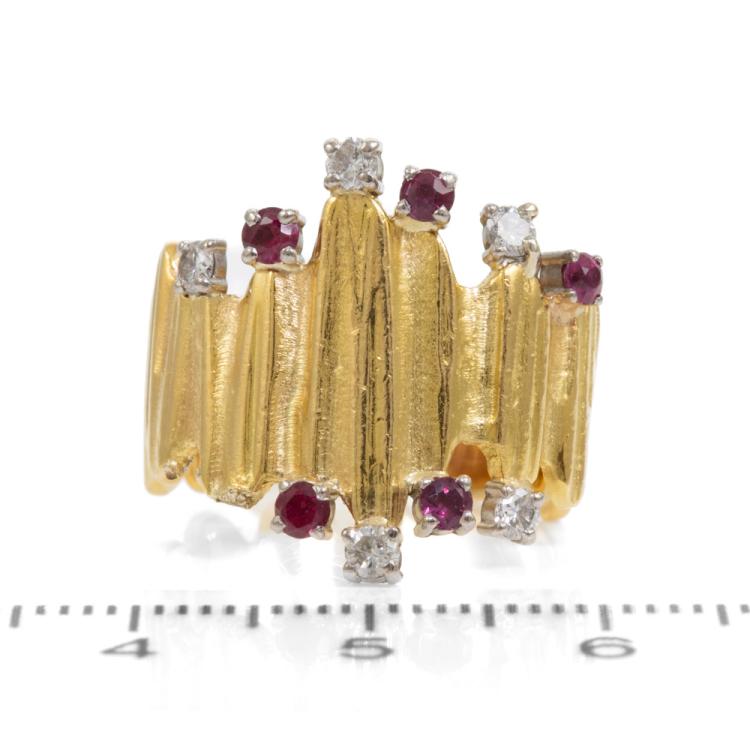 Ruby and Diamond fancy ring with round natural Rubies totalling approx. 0.25cts and round natural Diamonds totalling 0.20cts. 18ct yellow and white gold. Ring size L - ring resizing is not recommended. Band width: 7.4mm - 10.5mm. Weight: 8.8g. (Pre-owned)