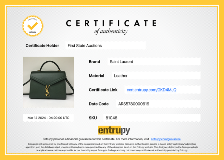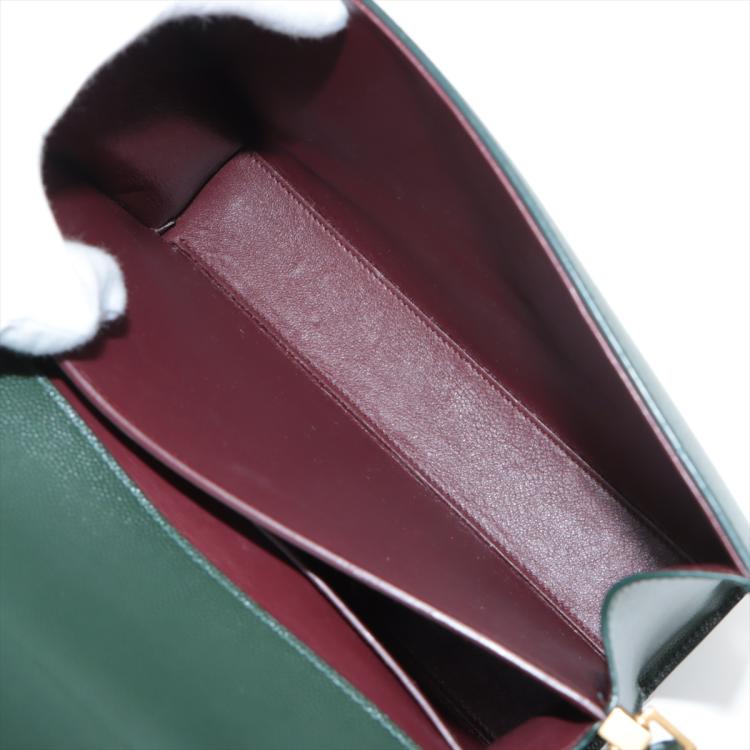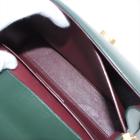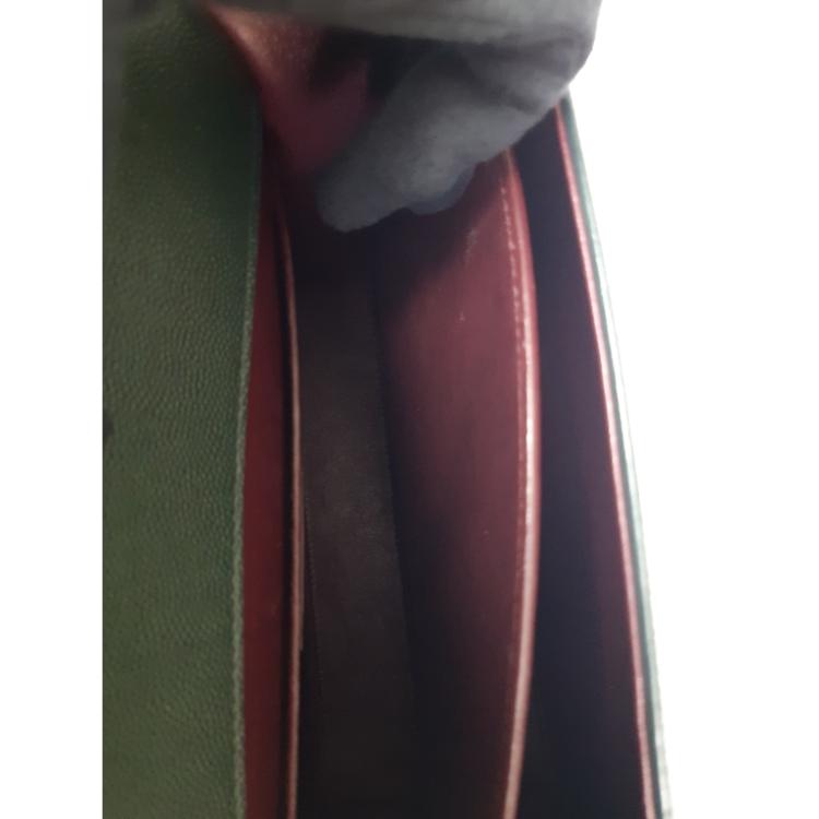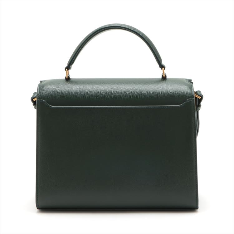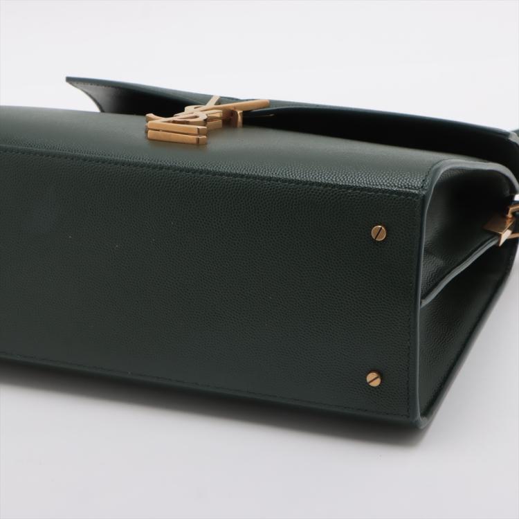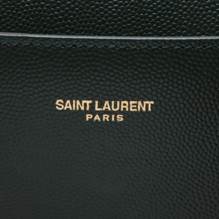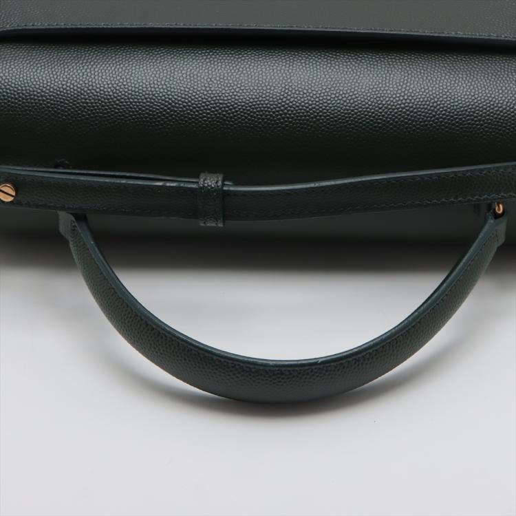 Saint Laurent Cassandra medium top handle bag in green grainy leather. Featuring an exterior pocket at back, single leather top handle, gold-toned hardware, frontal flap with pivoting YSL closure. This opens to a burgundy leather interior with 2 compartments and a patch pocket. Approximate dimensions: 24.5cm(L) x 19cm(H) x 11.5cm(D), 8cm handle drop and 51cm detachable strap drop. With Entrupy Certificate of Authenticity. (Pre-owned)