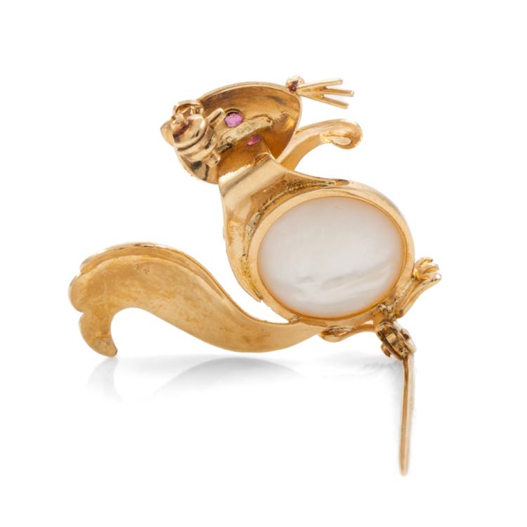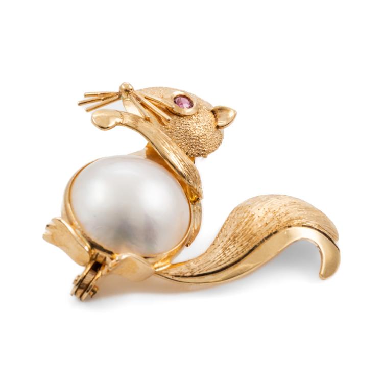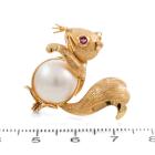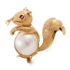 Squirrel Mabe Pearl and Ruby brooch with Mabe Pearl of 12.4mm and round natural Ruby of approx. 0.07ct. 14ct yellow gold. Weight: 4.8g. (Pre-owned)