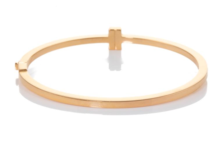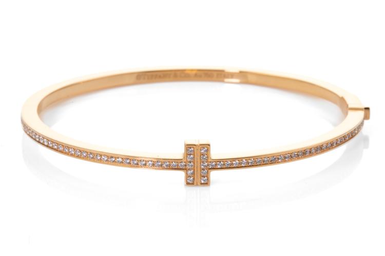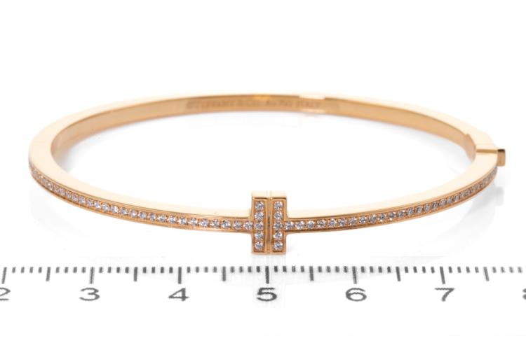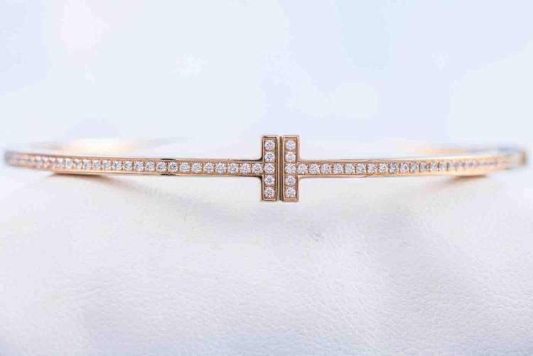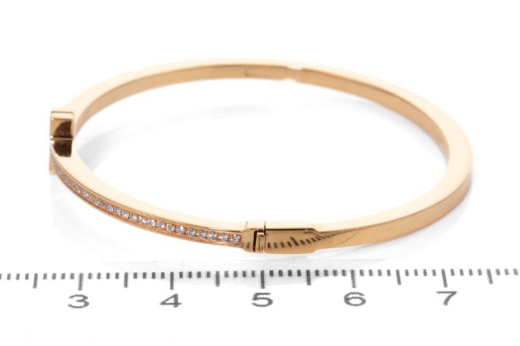 Tiffany & Co Diamond hinged wire bangle with round Natural Diamonds totalling 0.33cts (Estimated grading: F VS). 18ct rose gold. Inner Circumference: 15cm. Weight: 15.5g. With Certificate #417311. (Pre-owned)
