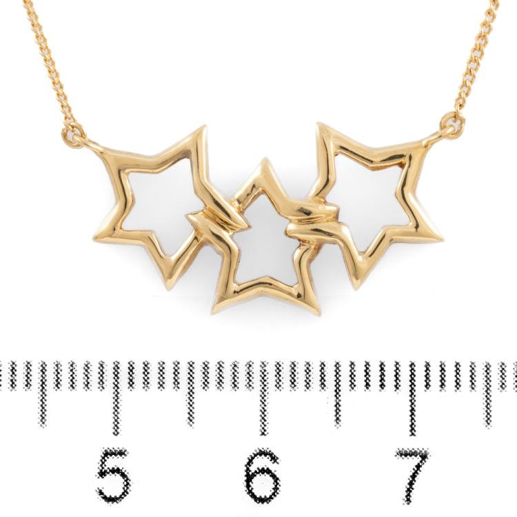 Tiffany & Co. Triple Star Necklace. Motif width: 25mm. 18ct yellow gold attached with 18ct yellow gold chain. Length: 46cm. Weight: 3.8g. (Pre-owned)