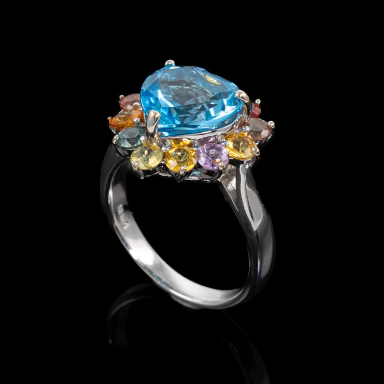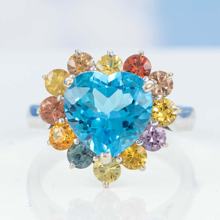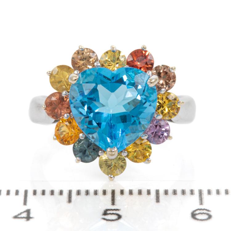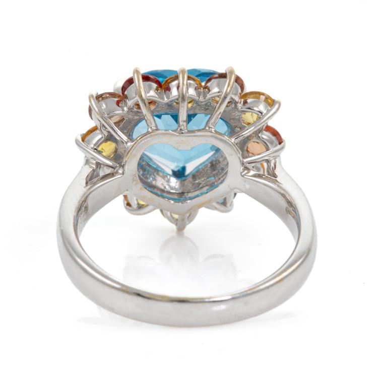 Topaz and Sapphire Ring with heart shape Natural blue Topaz of 4.32ct and surrounding round Natural multi-coloured Sapphires totalling 1.07cts. 18ct white gold. Ring size L. Band width: 2.7mm - 2.3mm. Weight: 6.4g. (Pre-owned)
