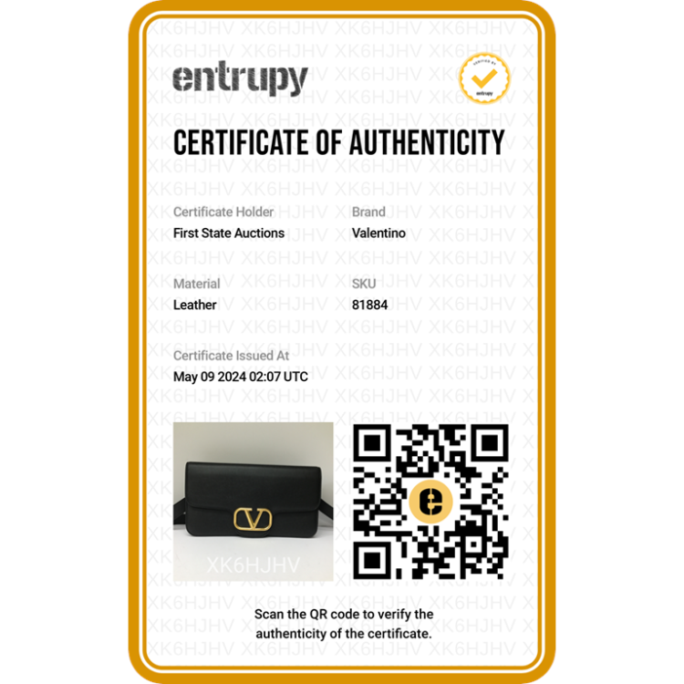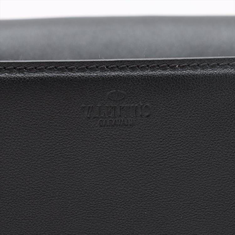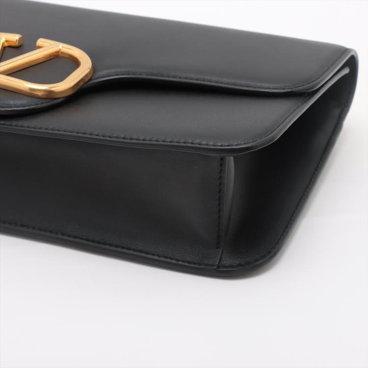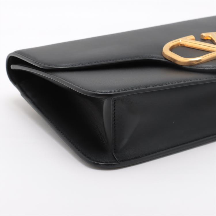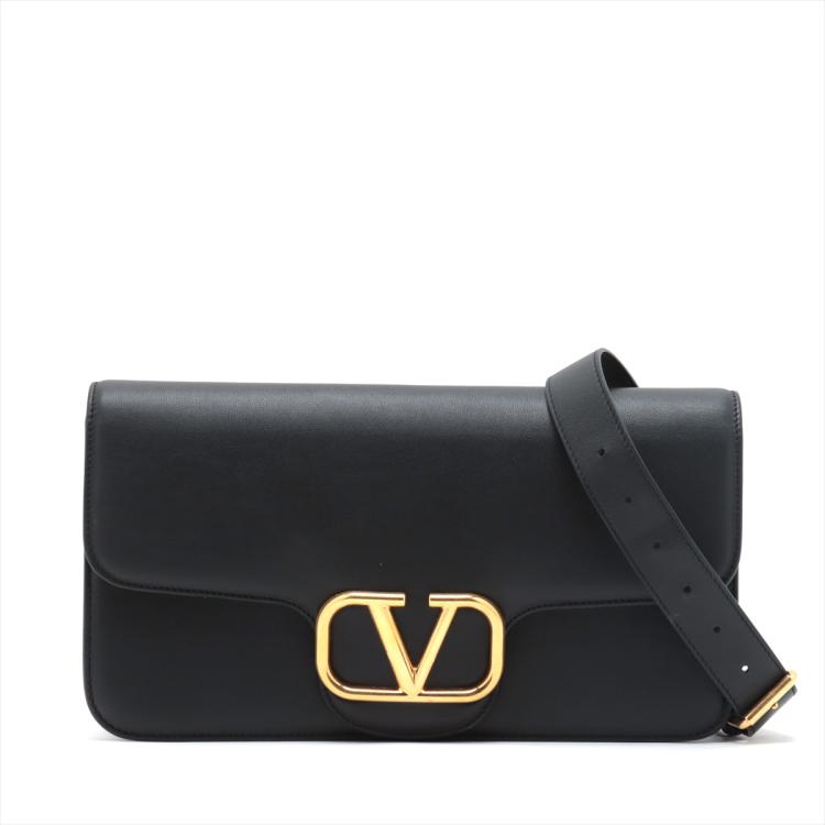 Valentino V logo 2way bag in black leather. Featuring gold-tone hardware, an exterior flat pocket at back, frontal flap with magnetic snap button with V logo plate detail. It opens to an black leather lining interior with flat pocket. Approximate dimensions: 31cm(L) x 17cm(H) x 6.5cm(D), 51cm adjustable strap drop height. Accompanied by a Valentino dust bag. With Entrupy Certificate of Authenticity. (Pre-owned)