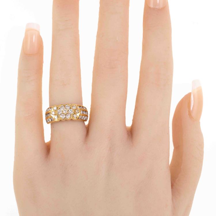 Diamond dress ring with round Natural Diamonds totalling 1.21ct (Estimated grading: I-J SI-P1). 18ct yellow gold. Ring size: J1/2 - Resizing not recommended. Band width: 3.90 - 5.50mm. Weight: 6.9g. (Pre-owned)