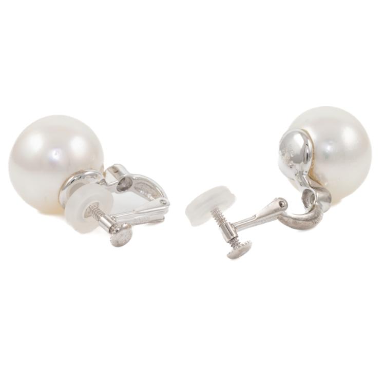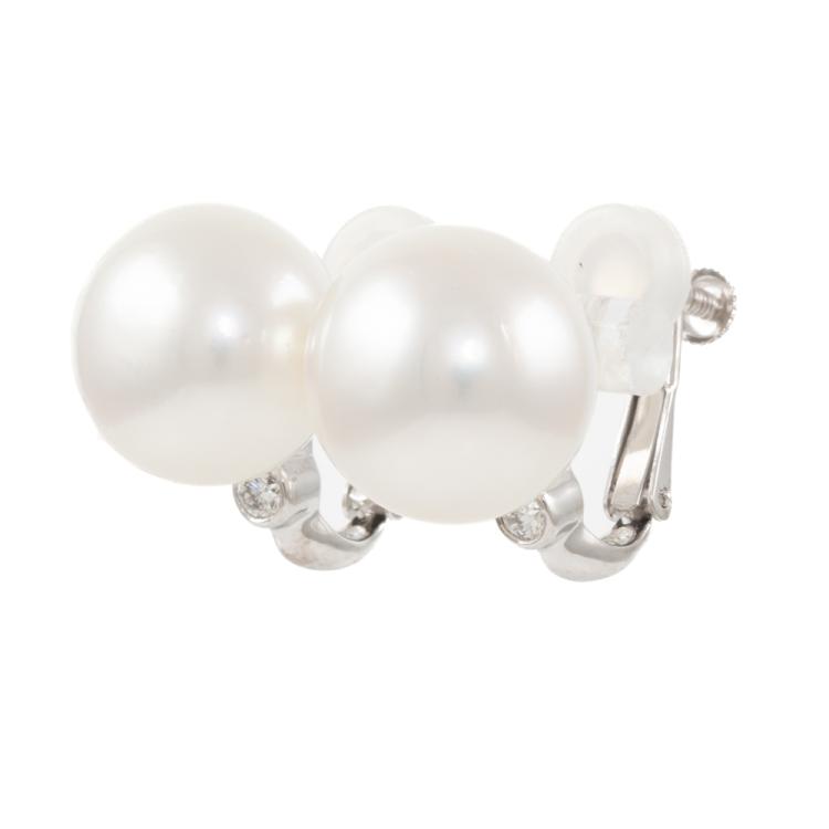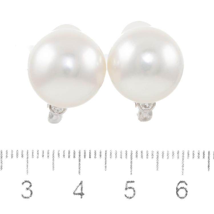 Pearl and Diamond clip-on screw back earrings (no posts) with button shape South Sea Pearls of 14.6mm and 14.8mm and 2 round natural Diamonds totalling 0.20ct. 18ct white gold with 14ct white gold backing. Weight: 13.6g (Pre-owned)