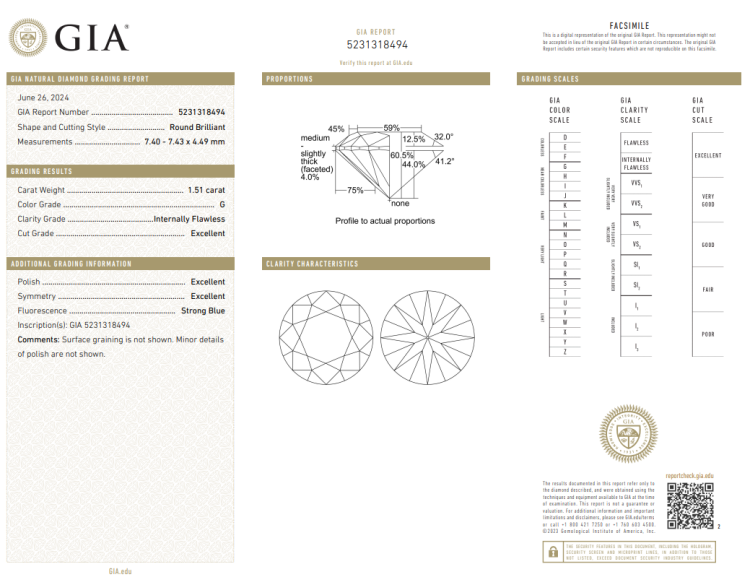 A loose round brilliant cut Natural Diamond of 1.51ct (with GIA report graded as G Internally Flawless #5231318494). (New)
