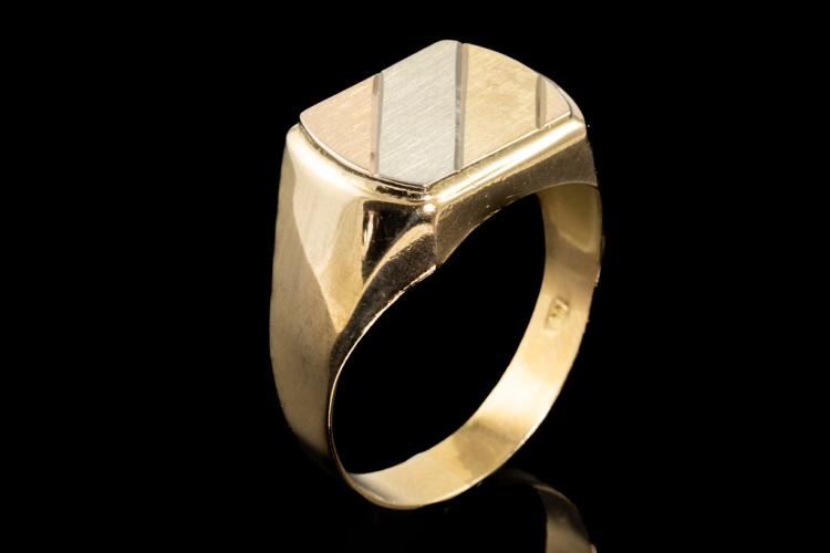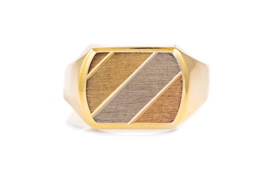 Mens ring with 18ct Yellow, rose and white gold face and 18ct yellow gold ring band. Ring size U. Band width: 4.0mm. Weight: 4.9g. (Pre-owned)