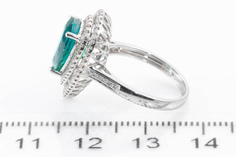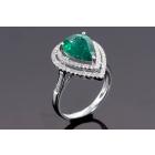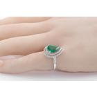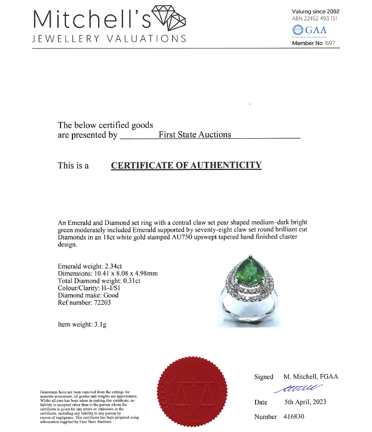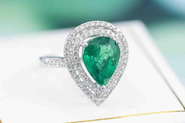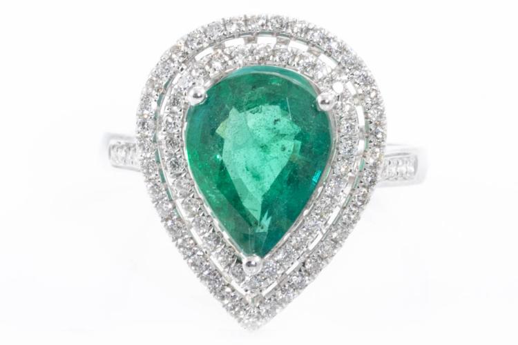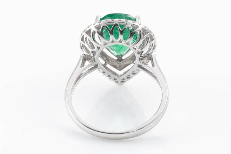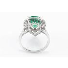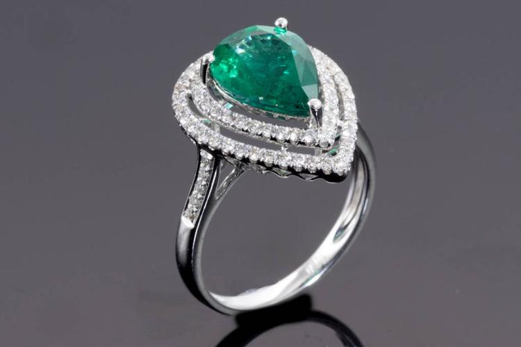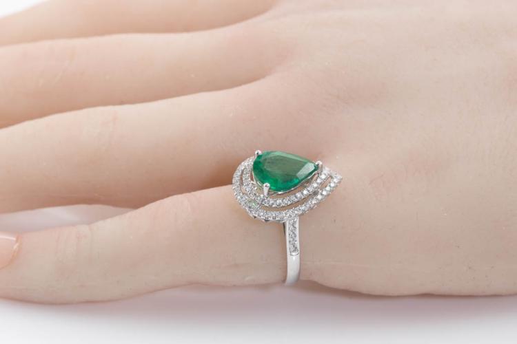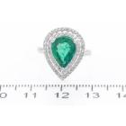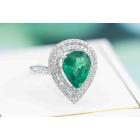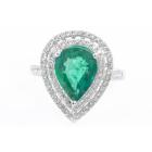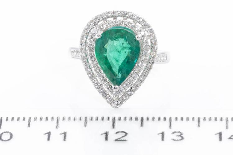 Emerald and Diamond ring with pear shape Natural Emerald of 2.34ct and round Natural Diamonds totalling approximate 0.31ct (Estimated grading H-I SI). 18ct white gold. Ring size K1/2. Band width: 2mm - 2.2mm. Weight: 3.1g. With Certificate #416830. (Pre-owned)