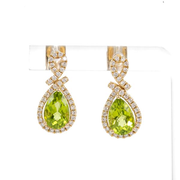 Peridot and Diamond earrings with pear shape Natural Peridot totalling 3.39cts and Natural round Diamonds totalling 0.41cts (Estimated grading: H SI). 14ct yellow gold. Weight: 4.8g. (New)
