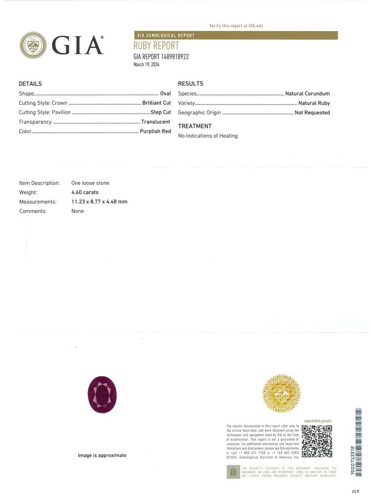 A loose oval shape unheated natural Ruby of 4.60ct (With GIA Report #1489818922). (As new)