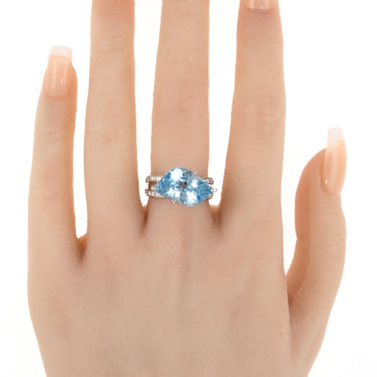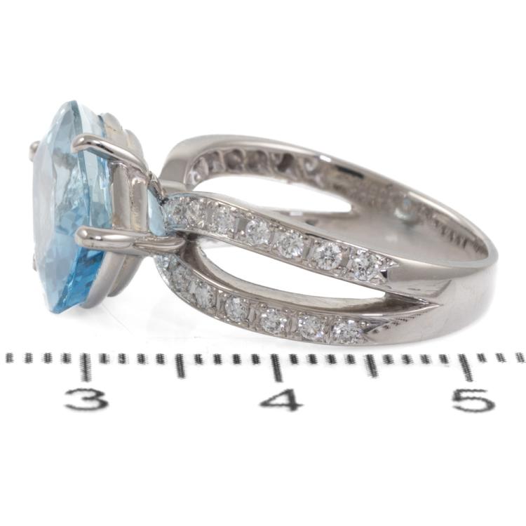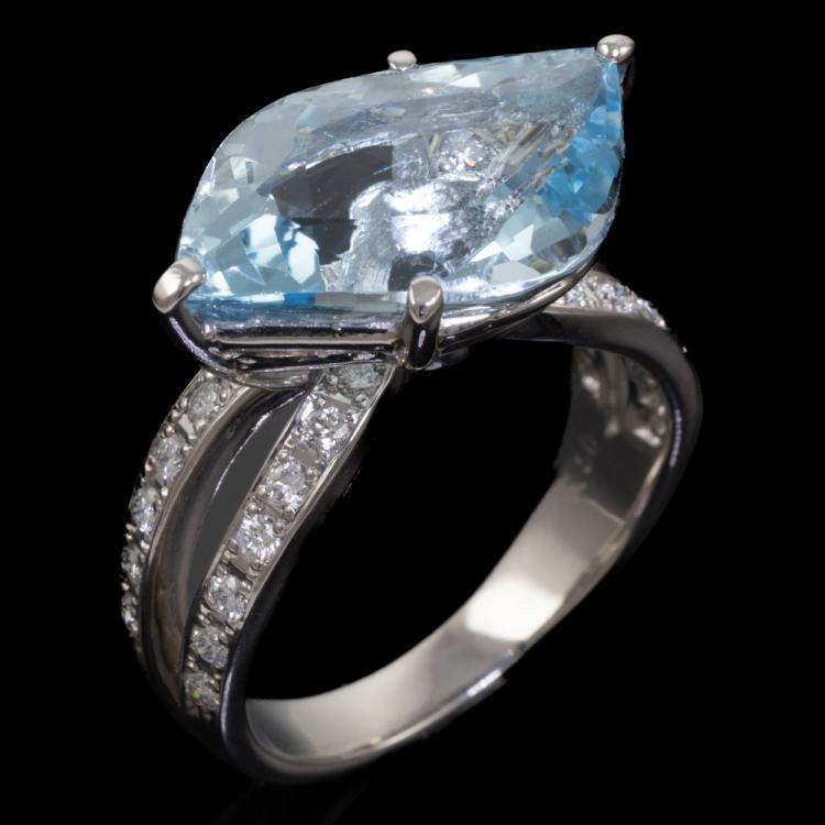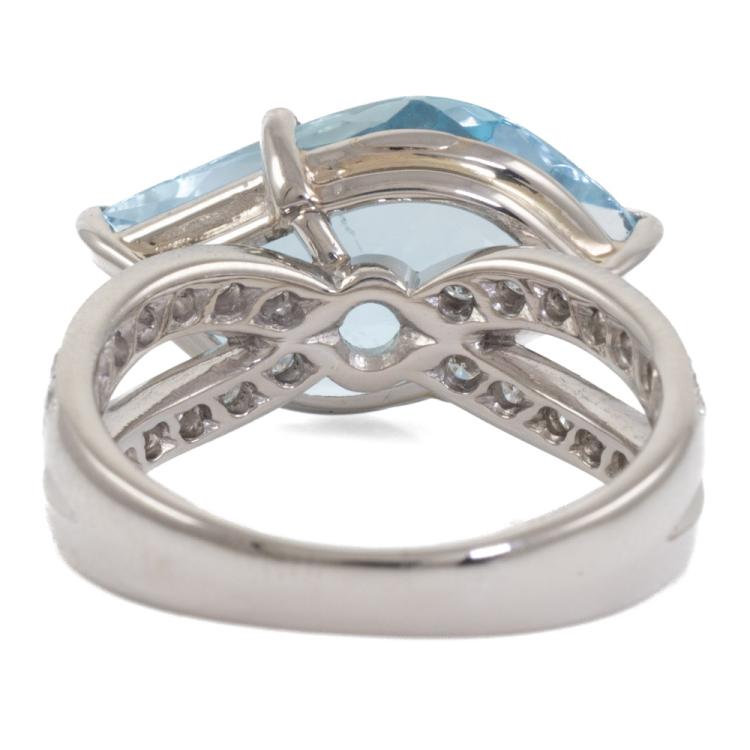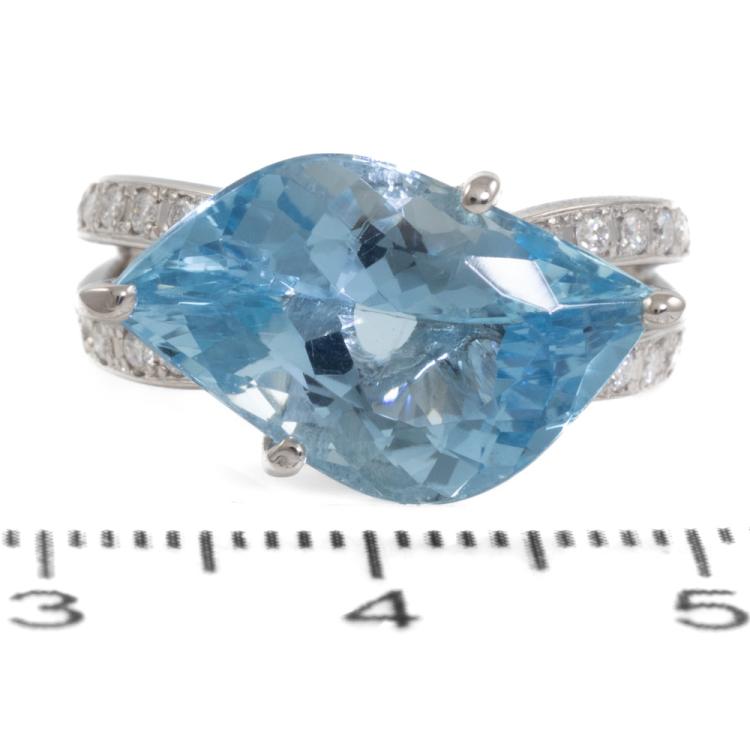 Aquamarine and Diamond ring with natural fancy shape Aquamarine of 5.90ct and round natural Diamonds totalling approximately 0.28ct. Platinum 900. Ring size L1/2. Minimum band width: 2.8mm. Weight: 8.5g. (Pre-owned)