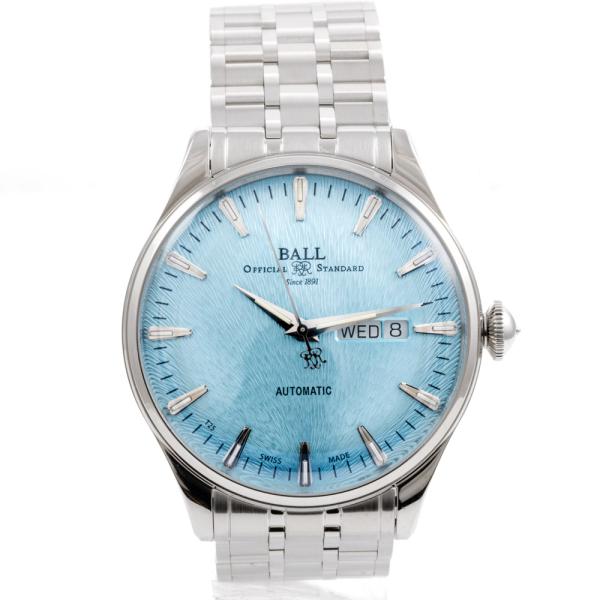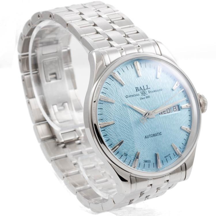 Ball Trainmaster Eternity stainless steel automatic mens watch. Ice blue dial, day & date, case diameter: 39mm, wrist size: 19.5cm, Swiss made. Ref# NM2080D-S2J-IBE. With Ball stainless steel bracelet and clasp. With Ball Premium International Warranty Certificate card and Ball box. 12 month FSA warranty (As new, Note: case and bracelet on original wrapping)