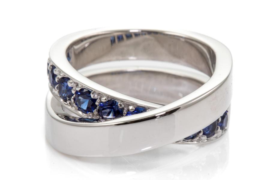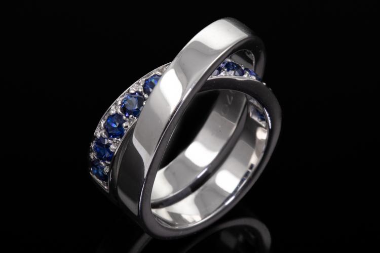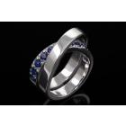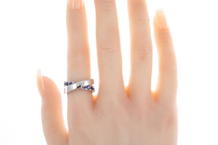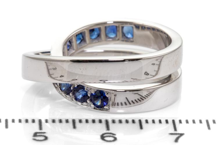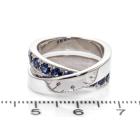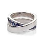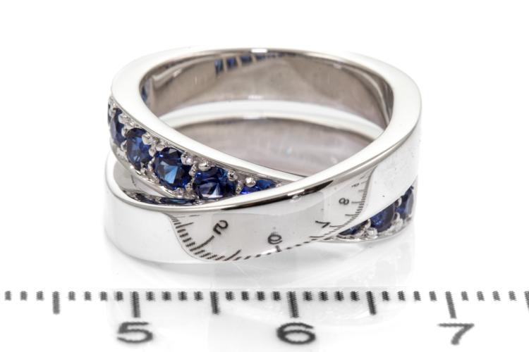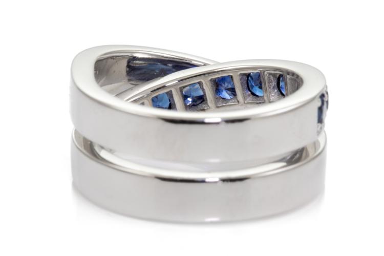 Cartier Paris Nouvelle Vague crossover ring with 11 round blue Sapphires totalling approximate 1.00cts. Circa 2001. 18ct white gold. Cartier stamped size: 51, L - ring resizing is note recommended. Width: 8.9mm. Weight: 13.9g. With Cartier certificate of authenticity dated 16/04/02. (Pre-owned)