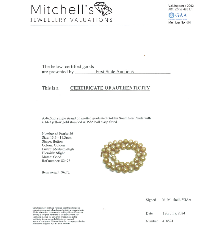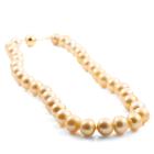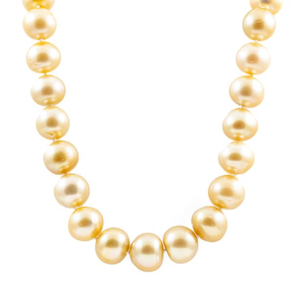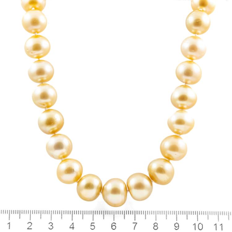 Pearl necklace with 36 graduated button shape Golden South Sea Pearls of 13.6mm-11.3mm. 14ct yellow gold 12mm ball clasp. Length: 46.5cm. Weight: 96.7g. With Certificate #418894. (Pre-owned)