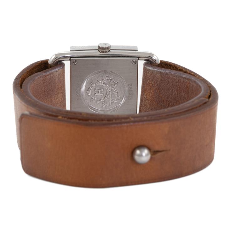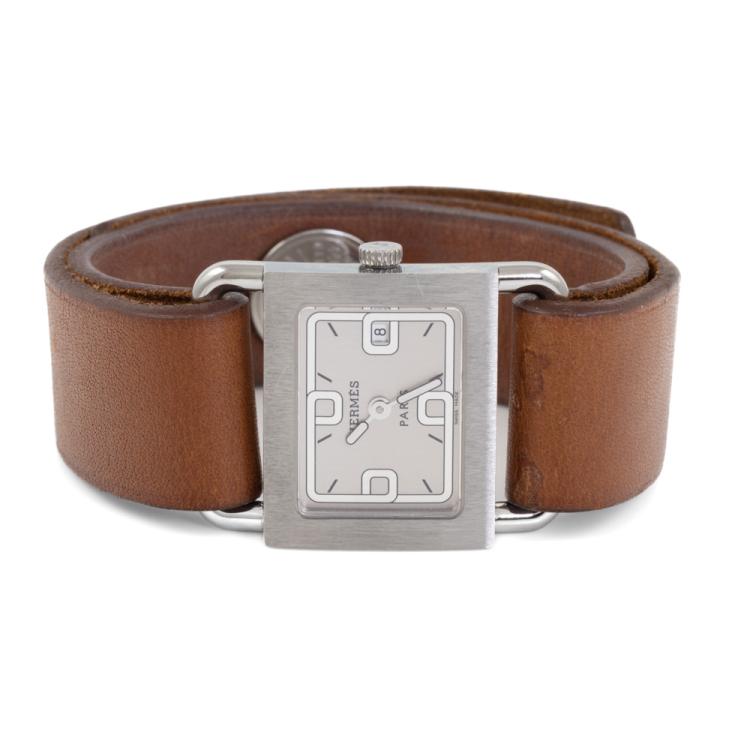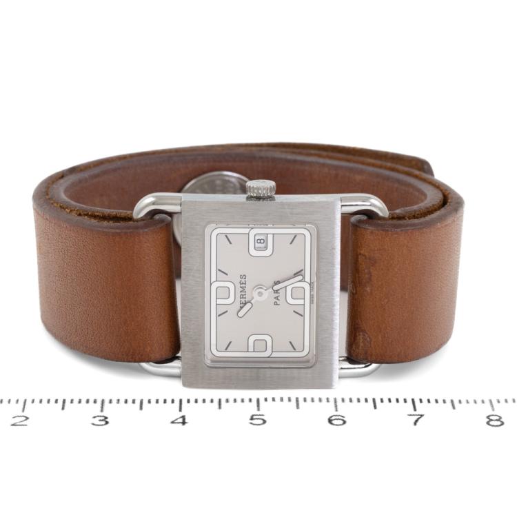 Hermes Barenia stainless steel quartz ladies watch. White dial, date, case diameter: 25mm x 21mm, strap length: 14cm, Swiss made. Ref# BA1.210. With Hermes brown leather strap and button lock. With Certificate of Authenticity, Hermes Certificate of Origin & Warranty dated 10/05/2008 and Hermes box. 3 month FSA warranty (Pre-owned)