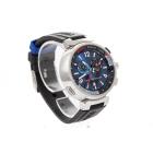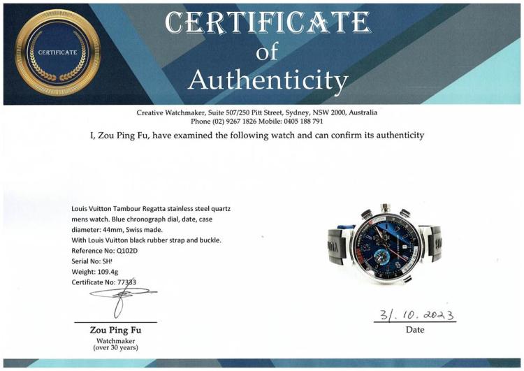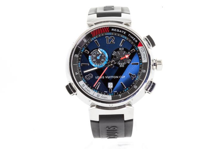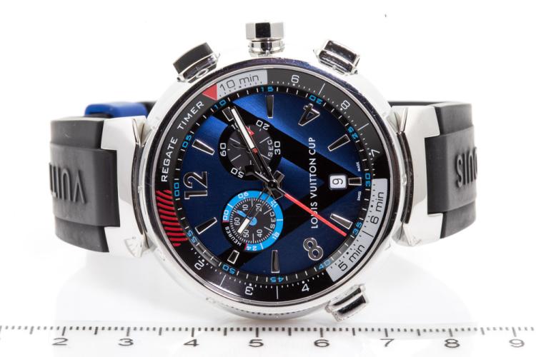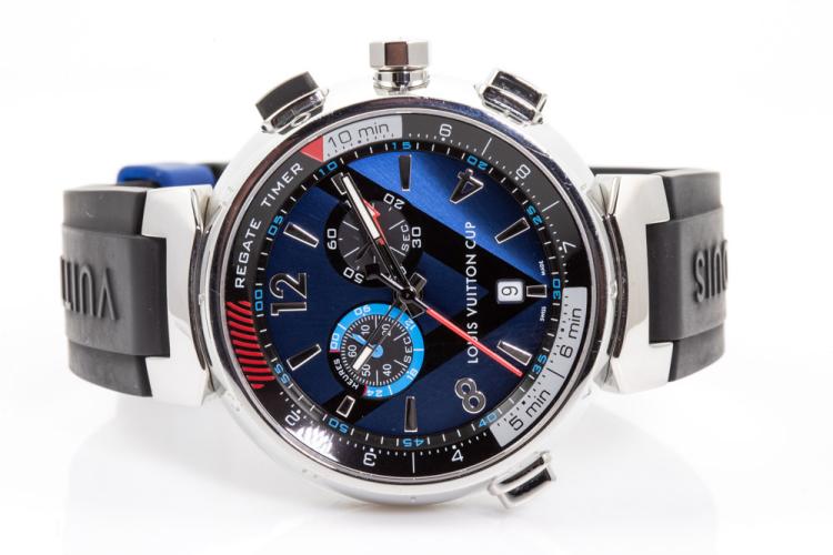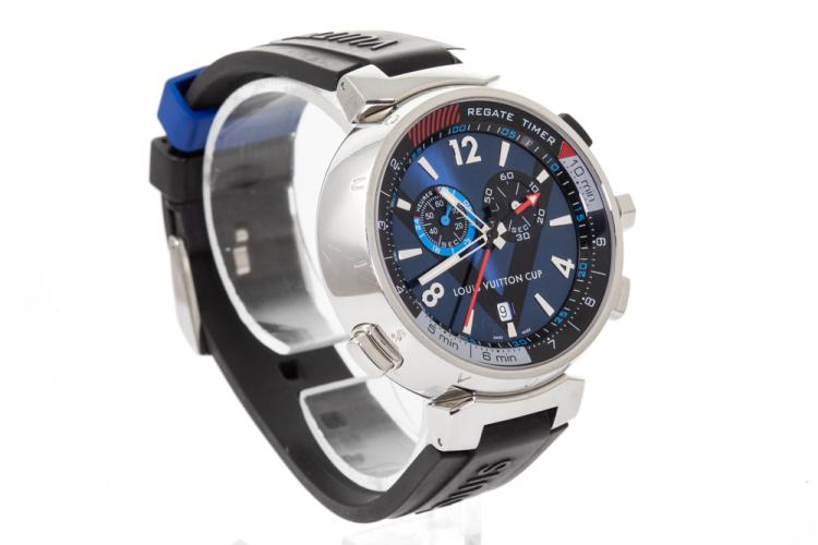 Louis Vuitton Tambour Regatta stainless steel quartz mens watch. Blue chronograph dial, date, case diameter: 44mm, strap length: 21cm, Swiss made. Ref# Q102D. With Louis Vuitton black rubber strap and buckle. With Certificate of Authenticity, Louis Vuitton International Guarantee Booklet dated 11/10/2011 and Louis Vuitton box. 3 month FSA warranty (Pre-owned)
