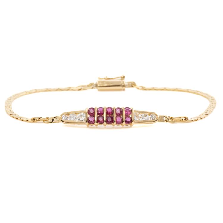 Ruby and Diamond bracelet with round natural Rubies totalling approximately 0.50ct and round natural Diamonds totalling approximately 0.40ct (Estimated grading: H-I SI). 18ct yellow gold. Length: 16.5mm. Weight: 5.3g. (Pre-Owned)