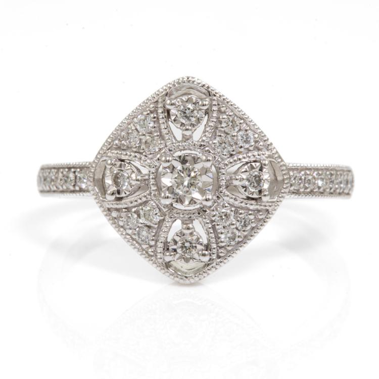 Diamond dress ring with round Natural Diamonds totalling 0.25ct. 18ct white gold. Ring size: N1/2. Band width: 1.7mm. Weight: 3.8g. (As New)^