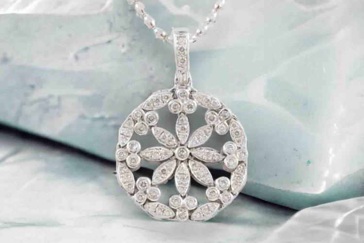 Diamond pendant/enhancer with round natural Diamonds totalling 0.80ct (Estimated grading: J SI). 18ct white gold with 18ct white gold adjustable max 50cm chain. Weight: 12.4g. (Pre-owned)