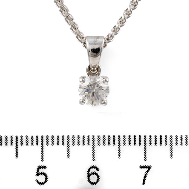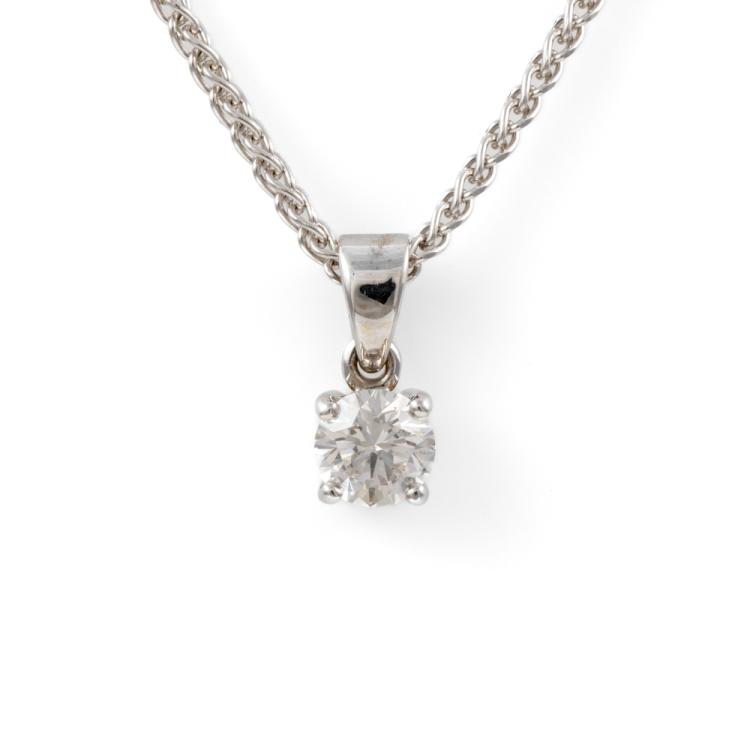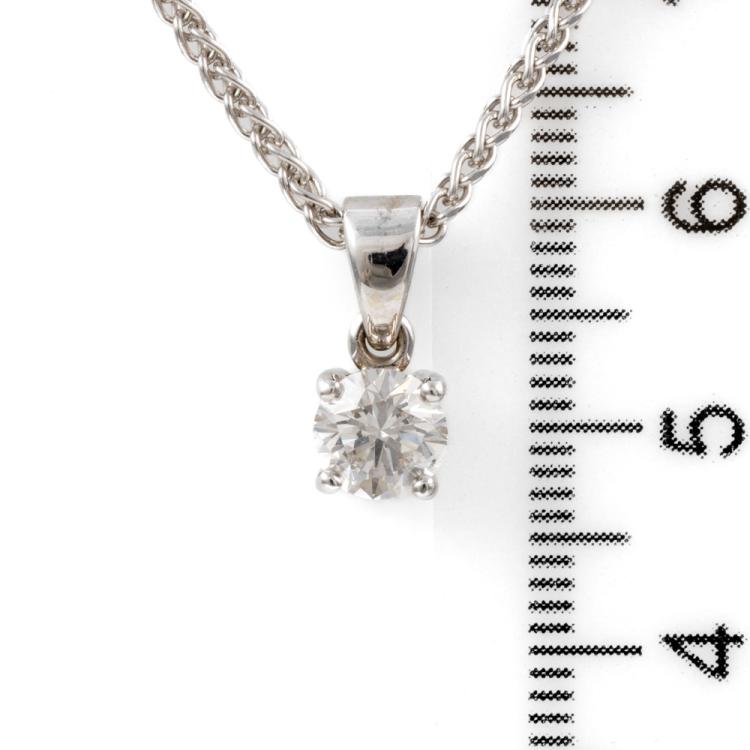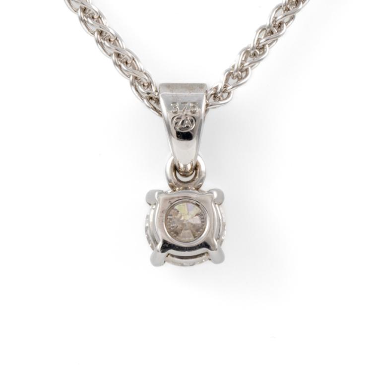 Diamond solitaire pendant with a round brilliant cut Natural Diamond of 0.80ct (with DIA memo graded as I SI2 #10111708). 9ct white gold with 42cm 9ct white gold chain. Weight: 5.9g. (Pre-owned)