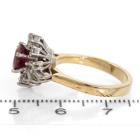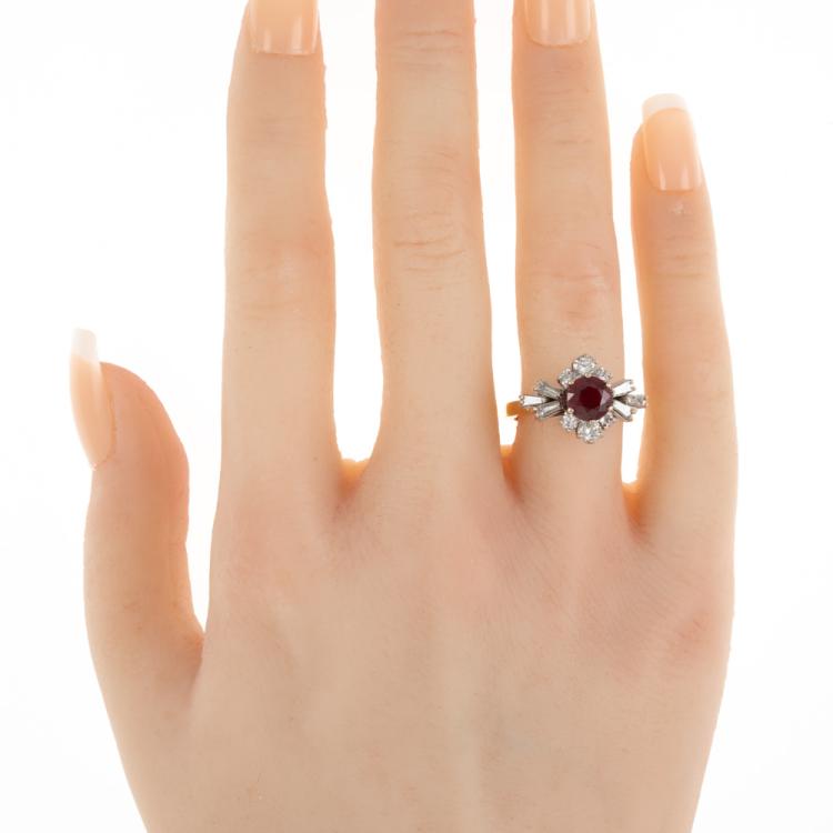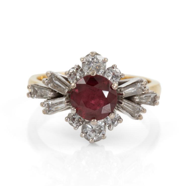 Ruby and Diamond ring with round Ruby of approximately 0.90ct and round & baguette cut Natural Diamonds totalling approximately 0.55ct (Estimated grading: H-I SI). 18ct yellow & white gold. Ring size: L. Band width: 2.7mm - 1.8mm. Weight: 5.7g. (Pre-owned)