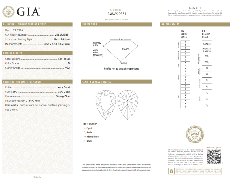 A loose pear shape Natural Diamond of 1.01ct (with GIA report graded as D VS2 #2484929851). (New)