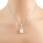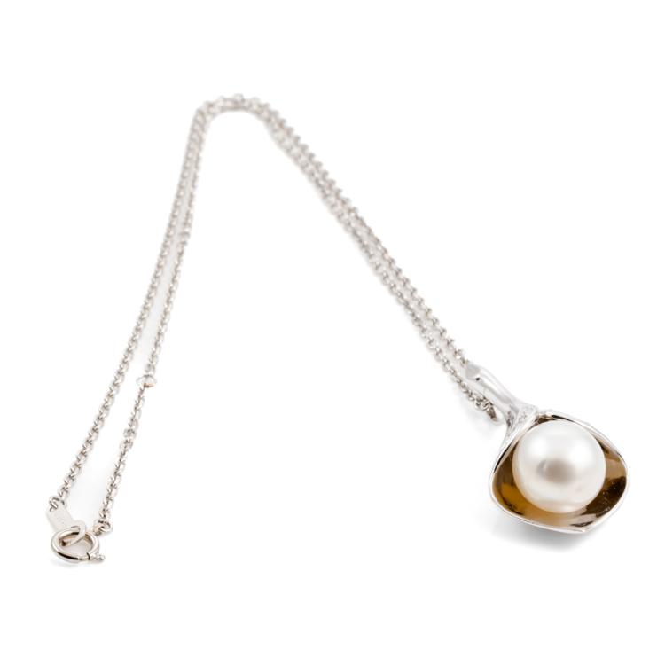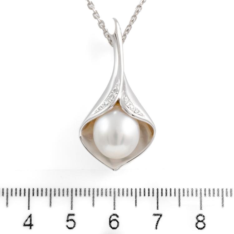 Pearl and Diamond pendant with South Sea Pearl of 10.8mm and round natural Diamonds totalling 0.06ct. 14ct white gold with 40cm platinum 850 chain. Weight: 12.2g. (Pre-owned)