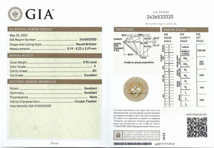 Diamond stud earrings with 2 round brilliant cut Natural Diamonds totalling 1.11cts (both with GIA Summary Reports graded as F SI1 #2436532020, 2438635226
