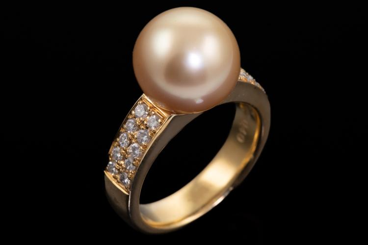 Pearl and Diamond ring with a Golden South Sea Pearl of 11.8mm and round Natural Diamonds totalling 0.40ct (Estimated grading: H SI). 18ct yellow gold. Ring size M. Weight: 11.1g. (Pre-owned)