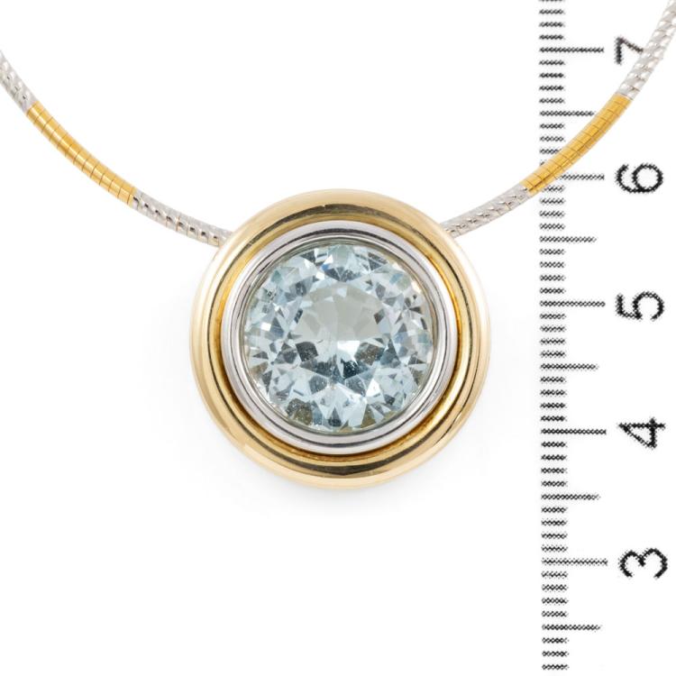 Topaz pendant with round bezel set natural blue Topaz of approximately 14.17ct. 18ct yellow & white gold with 45.5cm 18ct yellow & white gold Omega chain. Weight: 24.2g. With Valuation Certificate dated 08/08/2005. (Pre-owned)