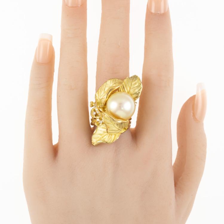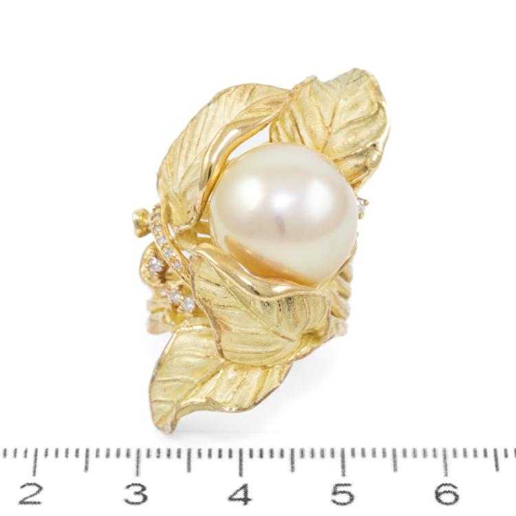 Pearl and Diamond ring with South Sea Pearl of 14.6mm and round natural Diamonds totalling 0.10ct. 18ct yellow gold. Ring size M. Band width: 4.6mm - 7.8mm.. Weight: 24.3g. With Certificate #418686. (Pre-owned)