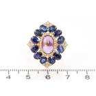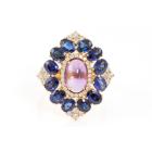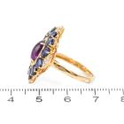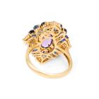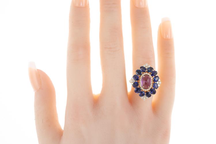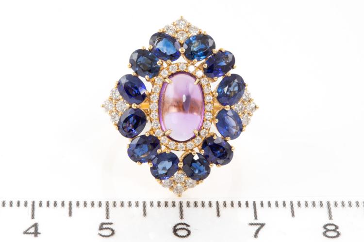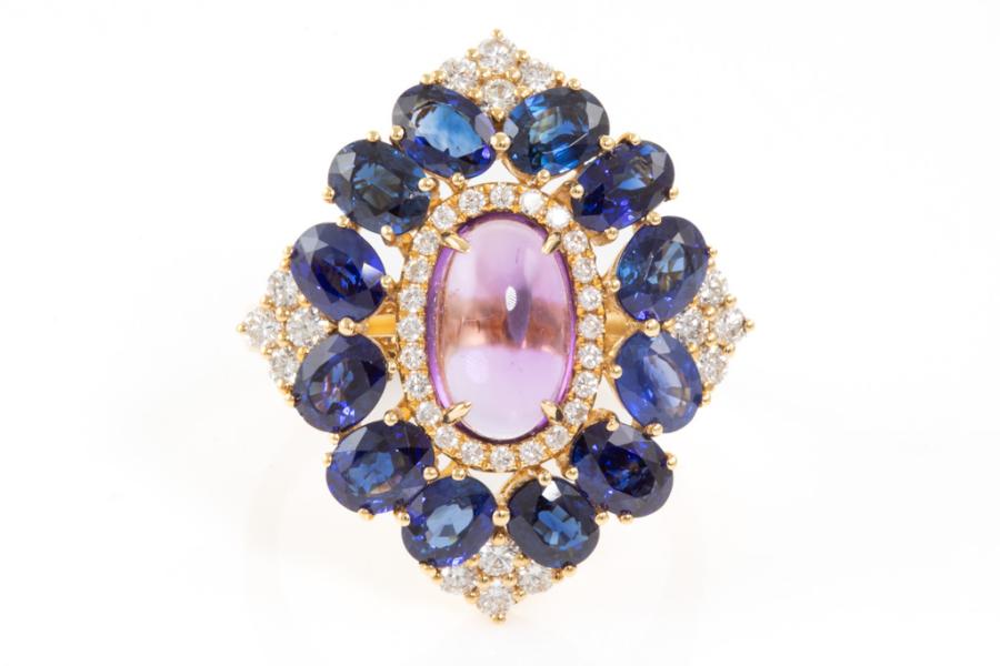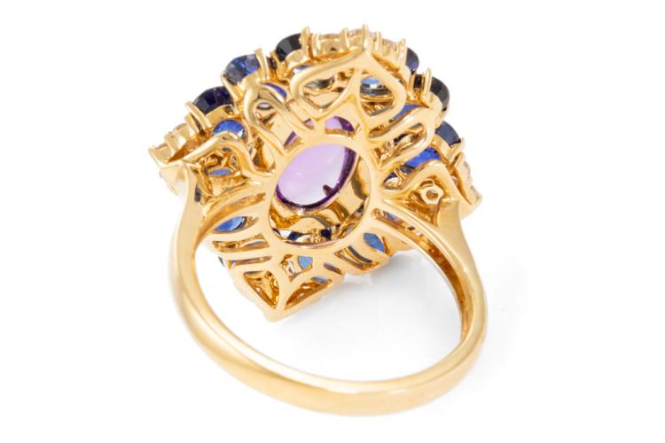 Amethyst and Diamond ring with Cabochon Natural Amethyst of approximate 1.63ct, 12 oval Natural blue Sapphires totalling approximate 2.40ct and Natural round Diamonds totalling approximate 0.36ct (Estimated grading: I-J SI). 18ct yellow gold and platinum 900. Ring size M. Weight: 7.0g. (Pre-owned)
