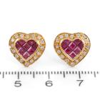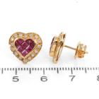 Ruby and Diamond heart design earrings with carre cut Natural Rubies totalling 2.00cts and round Natural Diamonds totalling 0.64cts (Estimated grading: H SI). 18ct yellow gold. Weight: 4.5g. (Pre-owned)