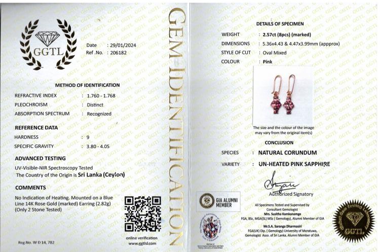 Sapphire shepherds hook earrings with oval shape unheated Ceylon natural pink Sapphires totalling 2.57ct. 14ct rose gold. Weight: 2.8g. With GGTL Report #206182. (As new)