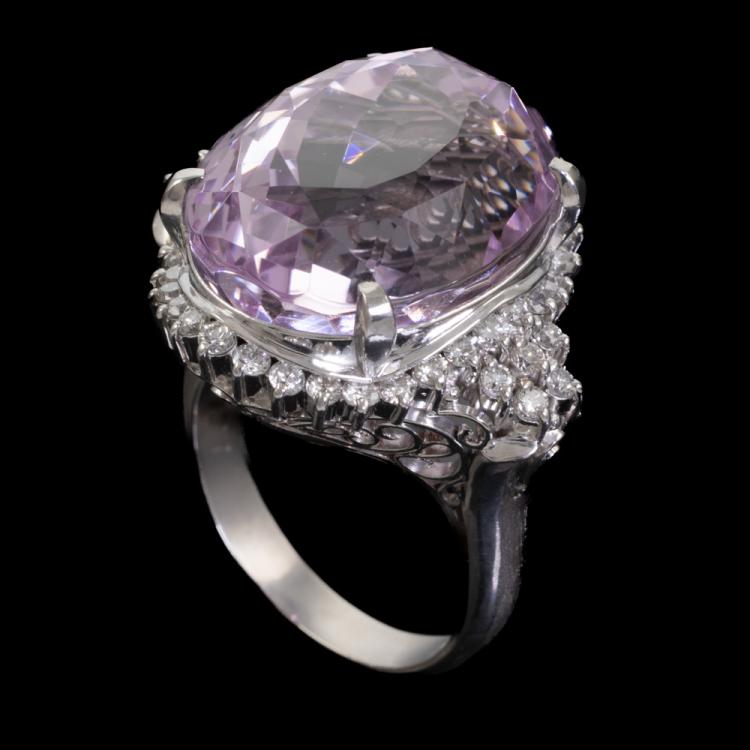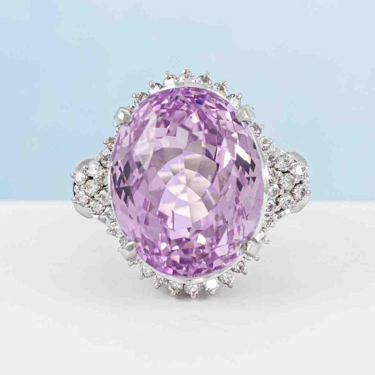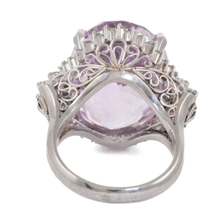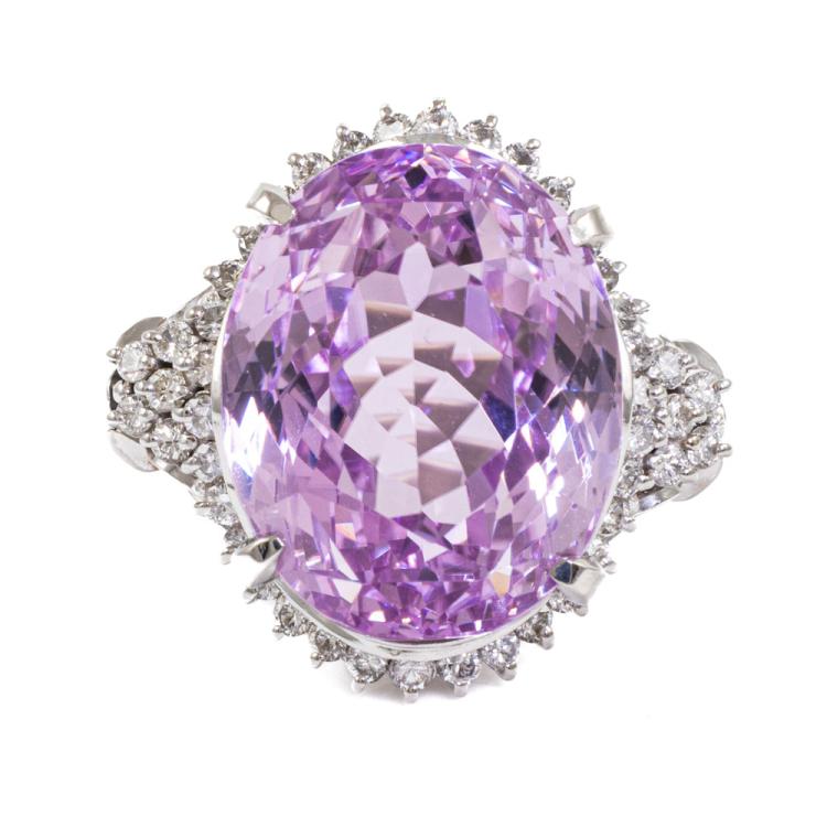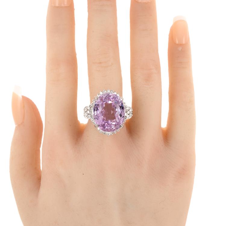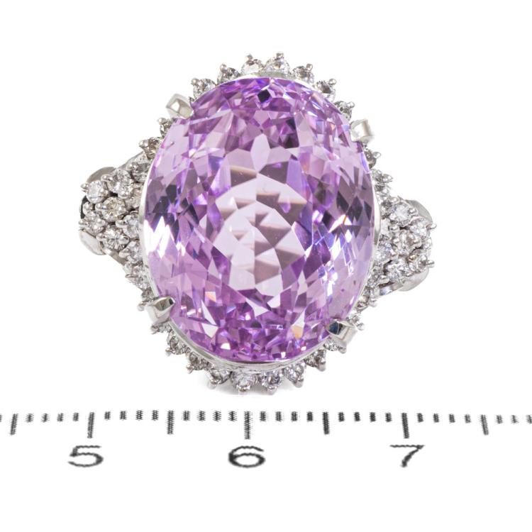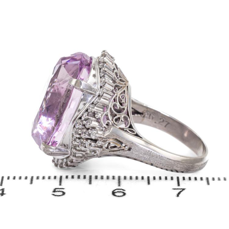Kunzite and Diamond ring with oval shape natural Kunzite of 26.27ct and round natural Diamonds totalling 0.80ct (Estimated grading: H-I SI). Platinum-900. Ring size: L1/4. Band width: 2.9mm-4.2mm. Weight: 17.1g. (Pre-owned)