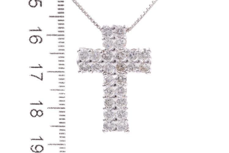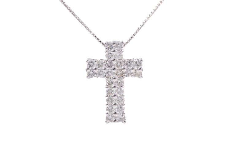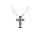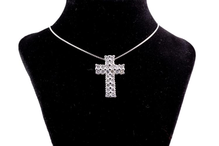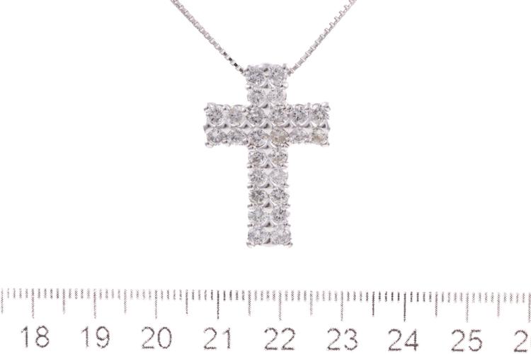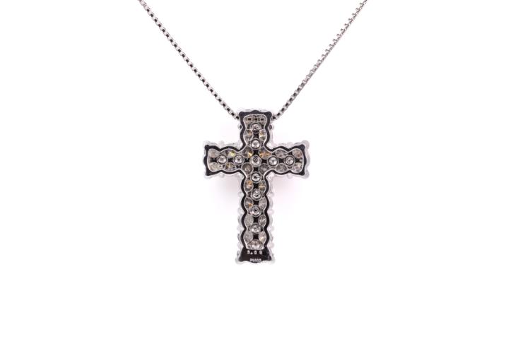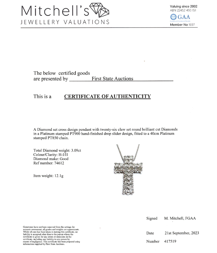 Diamond cross pendant with round Natural Diamonds totalling 3.09cts (Estimated grading: H-I P1). Platinum - 900 with max 40cm Platinum - 850 chain. Weight: 12.1g. With Certificate #417519. (Pre-owned)