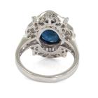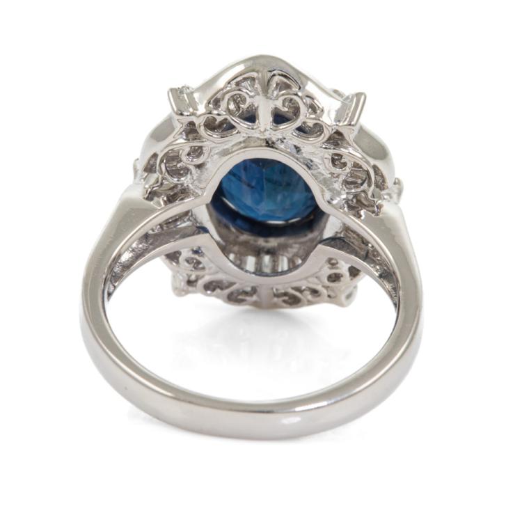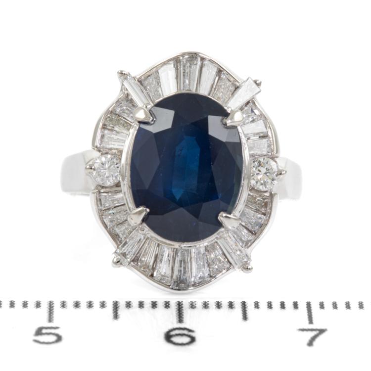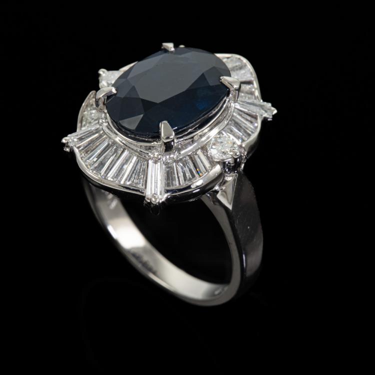 Sapphire and Diamond ring with oval blue natural Sapphire of 4.69ct with round & baguette cut natural Diamonds totalling 1.03ct (Estimated grading: G-I SI-P1). Platinum 900. Ring size L. Band width 3.6mm - 2.4mm. Weight: 10.0g. With Certificate #418758. Pre-owned)