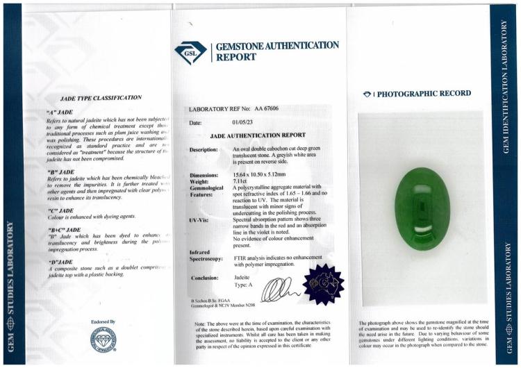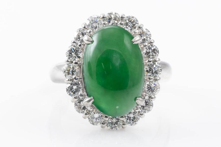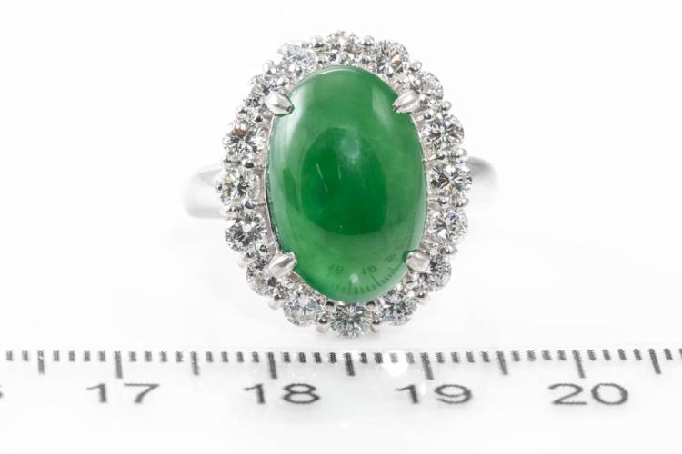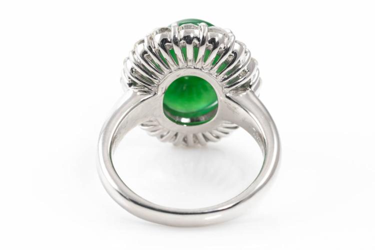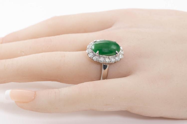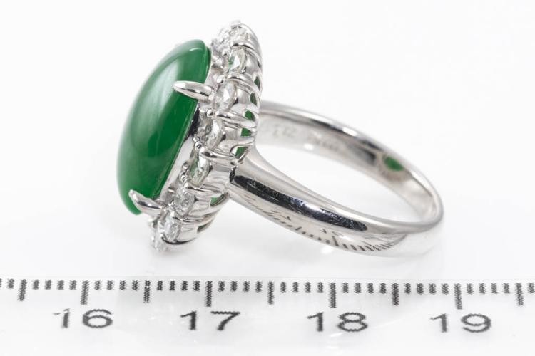Jade and Diamond ring with oval cabochon cut Natural green Jadeite Jade - Type A of 7.11ct and round Diamonds totalling 1.46ct (Estimated grading: H SI). Platinum-900. Ring size N. Weight: 14.1g. With GSL Gem Report #AA67606. (Pre-owned)
