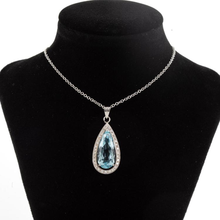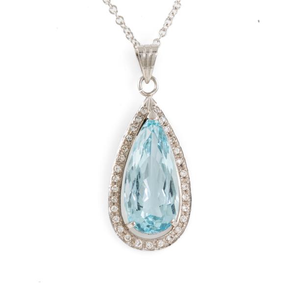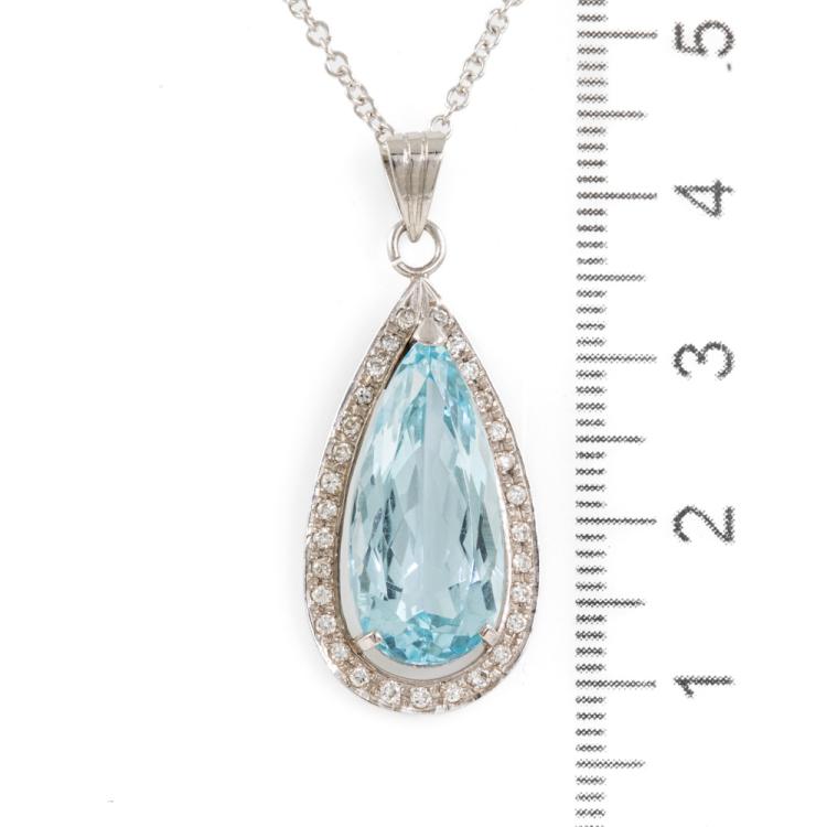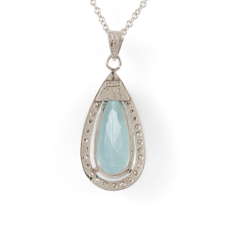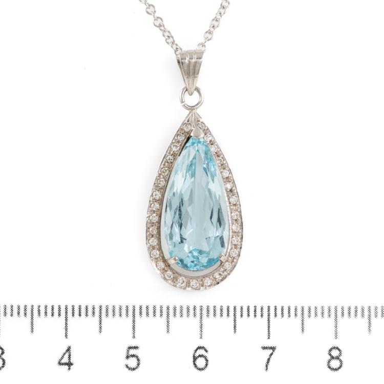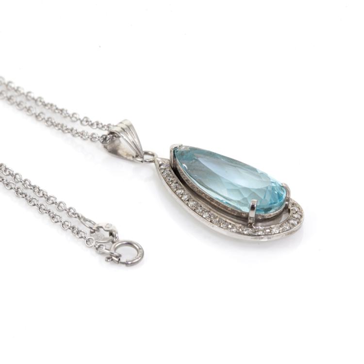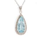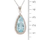 Aquamarine and Diamond pendant with Pear shape Natural Aquamarine of 7.46ct (note - Aquamarine with minor chip near 12 o'clock position) and round Natural Diamonds totalling 0.26ct. Platinum 900 with 44cm 18ct white gold chain. Weight: 8.2g. (Pre-owned)