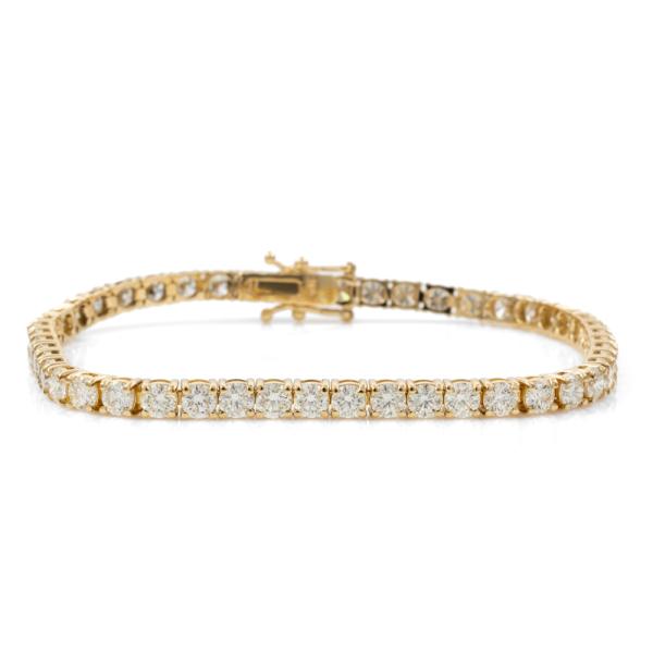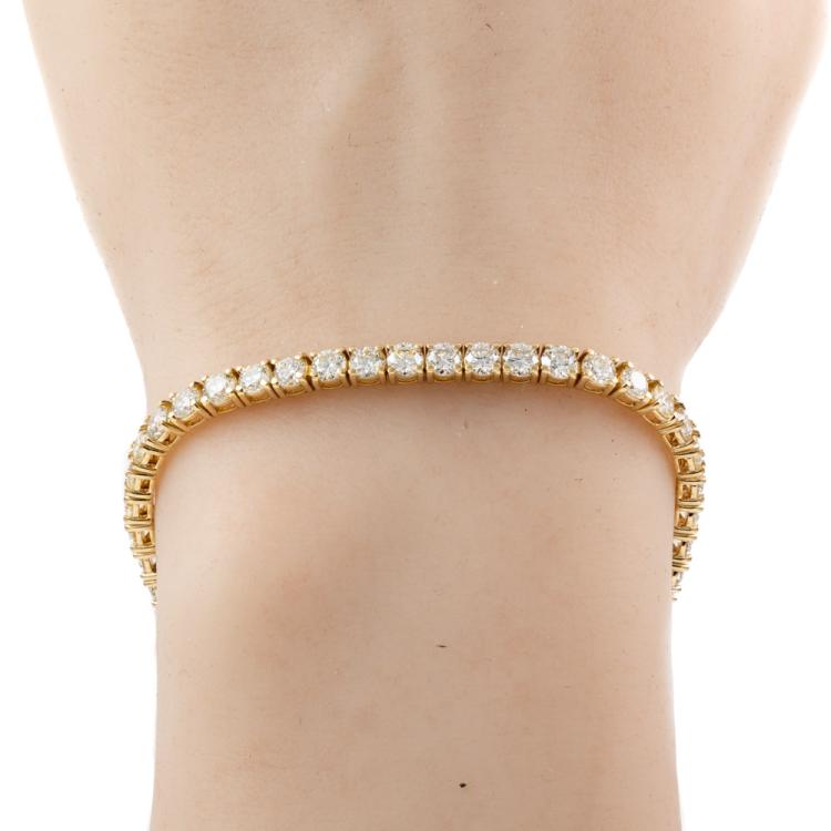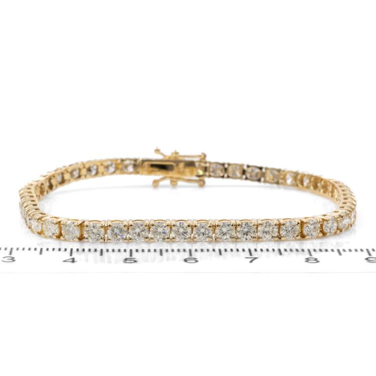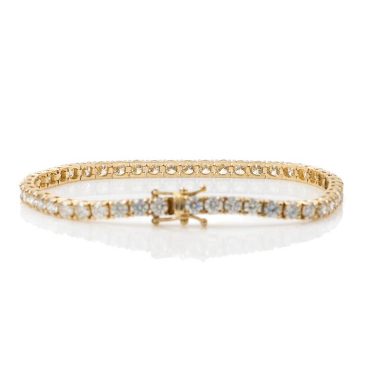 Diamond tennis bracelet with 48 round brilliant cut Natural Diamonds totalling 8.20cts (Estimated grading: J-K SI). 18ct yellow gold, length: 18cm. Weight: 12.6g. With Valuation Certificate #417972. (New)