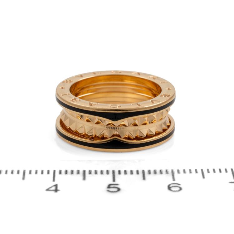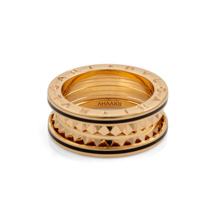 Bvlgari B.Zero1 Rock two-band ring. 18ct rose gold with studded spiral and black ceramic inserts on edges. Bvlgari stamped size 52, K1/2 - ring resizing is not recommended. Band width: 8.4mm. Made in Italy. Weight: 10.2g. With Bvlgari authenticity card dated 30/08/20. With Bvlgari box. (Pre-owned)