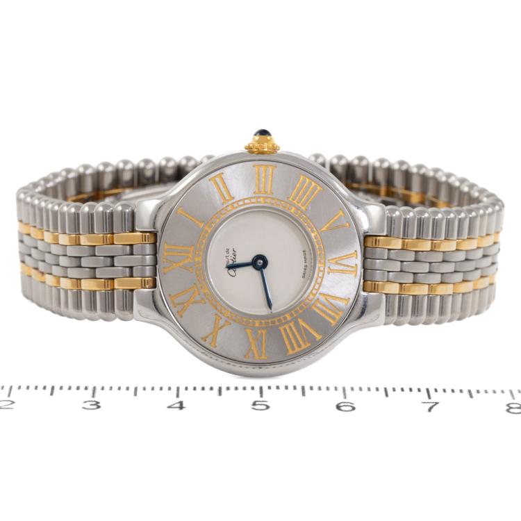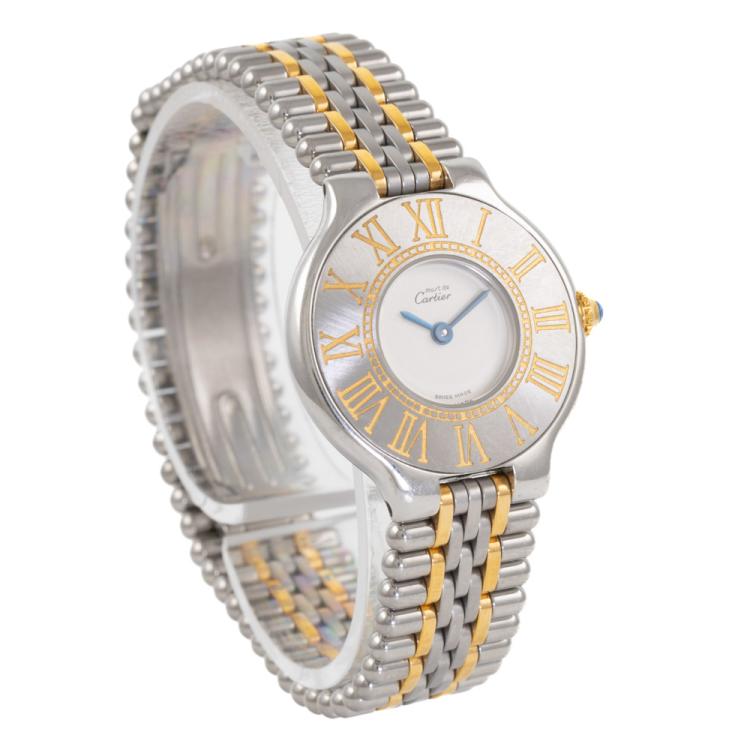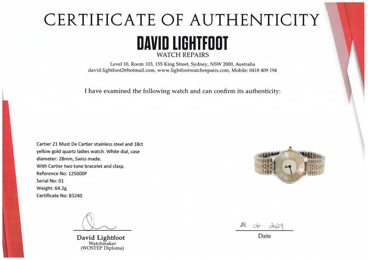 Cartier 21 Must De Cartier stainless steel and 18ct yellow gold quartz ladies watch. White dial, case diameter: 28mm, wrist size: 16.5cm, Swiss made. Ref# 125000P. With Cartier two tone bracelet and clasp. With Certificate of Authenticity. 3 month FSA warranty. (Pre-owned)