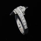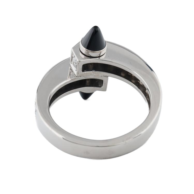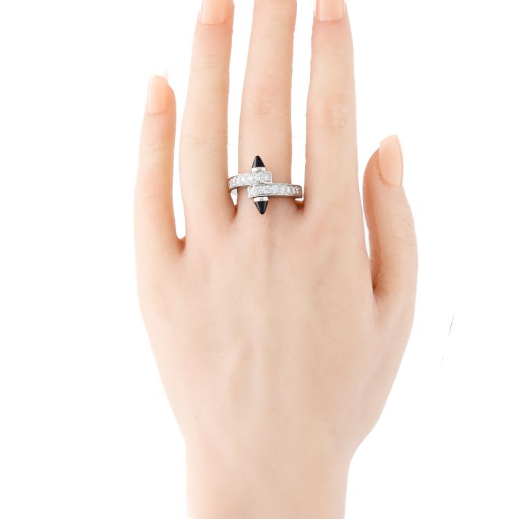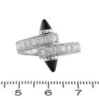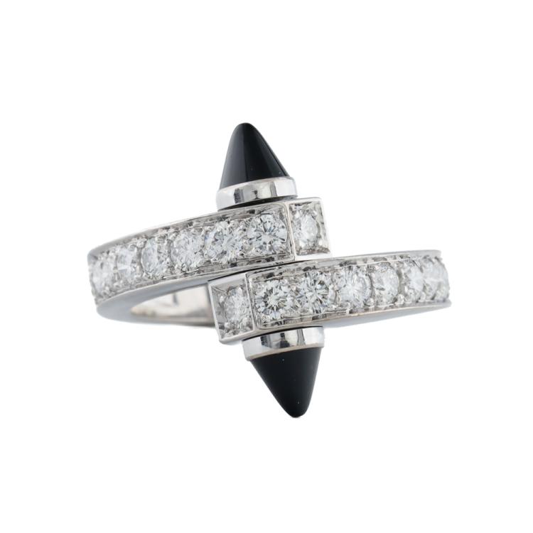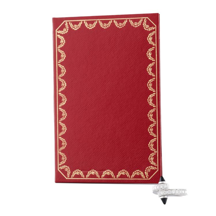 Cartier Menottes Diamond & Onyx Ring with 20 round brilliant cut Natural Diamonds totalling approximately 1.50ct (Estimated grading: F VS). 18ct white gold. Cartier stamped size 59, measures as Australian size: Q 1/2 - ring resizing is not recommended. Band width: 4.2mm - 3.7mm. Weight: 11.3g. With Cartier Certificate dated: 13/08/2005. With Cartier purchase papers dated: 23/10/2014. With Cartier inner box. (Pre-owned)