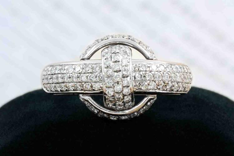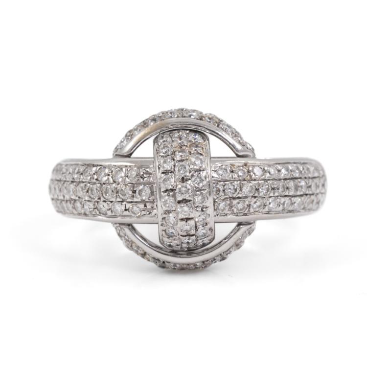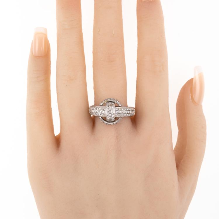 Chimento knot design ring with round natural Diamonds totalling approximately 0.85ct (Estimated grading: G-H SI). 18ct white gold. Ring size S1/4. Band width: 3.8mm-4.8mm. Weight: 11.6g. (Pre-owned)