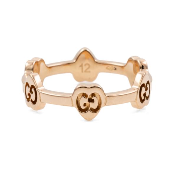 Gucci G Icon Heart station ring. 18ct rose gold. Stamped size 12, L- ring resizing is not recommended. Minimum band width: 2mm. Weight: 3.0g. (Pre-owned)