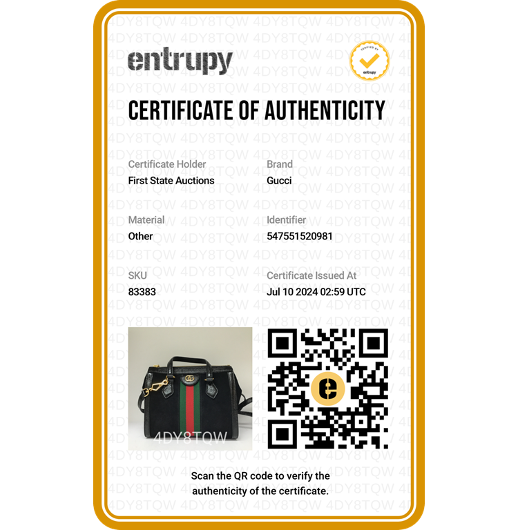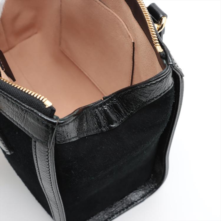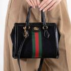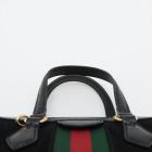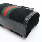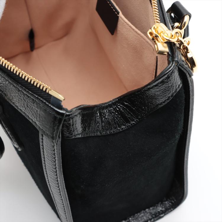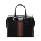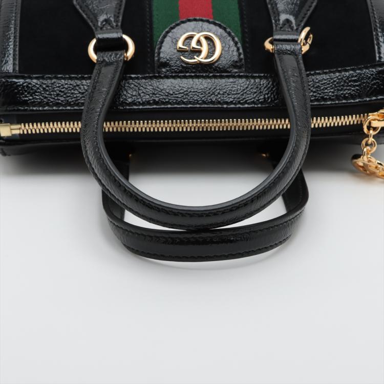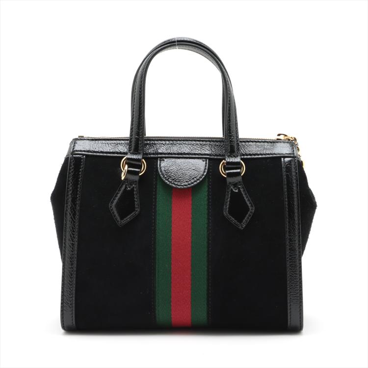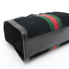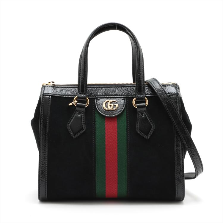 Gucci small Ophidia web tote in black suede. Featuring with shiny black leather trims and dual top handles, green & red web stripe details, gold-toned hardware, and a detachable and adjustable strap. The zip closure opens to a beige microfibre lining interior with a patch pocket. Approximate dimensions: 24cm(L) x 19.5cm(H) x 10.5cm(D), 10cm handle drop and 65.5cm strap drop. Accompanied by a Gucci dust bag. With Entrupy Certificate of Authenticity. (Pre-owned)