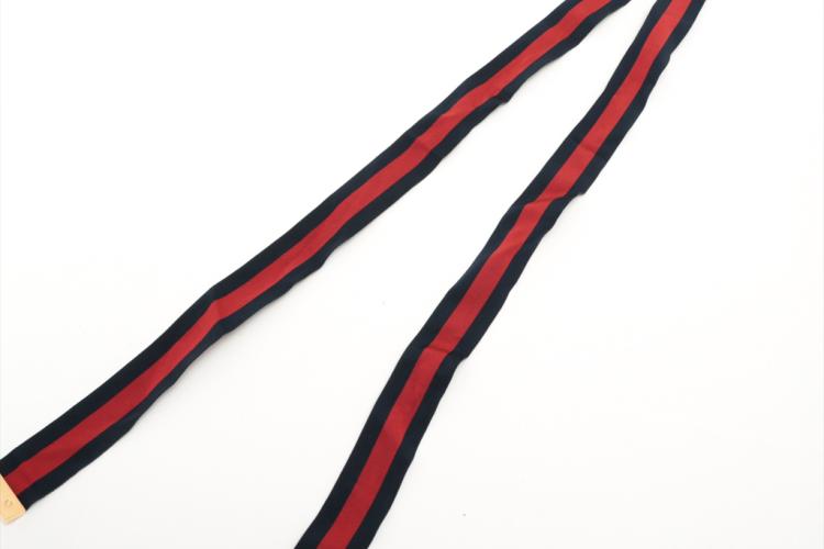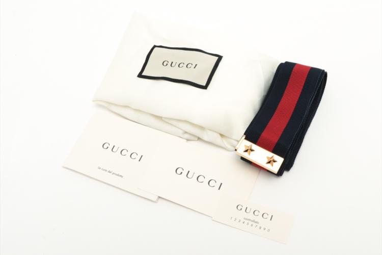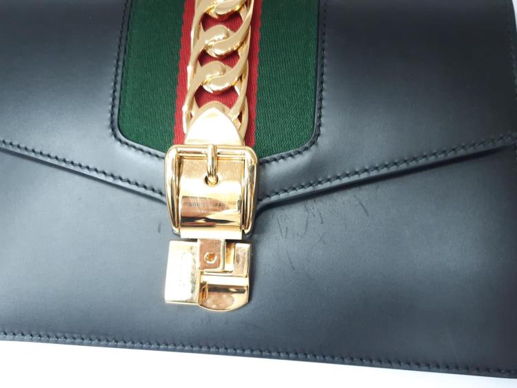 Gucci small Sylvie shoulder bag in black calfskin leather. Featuring a front flap detailed with a central red and navy web stripe, a chain buckle lock closure at front, gold-toned hardware. The flap opens to a microfiber lining interior with zipper and patch pockets. Approximate dimensions: 26cm(W) x 17cm(H) x 8cm(D), 35cm leather strap drop. Accompanied by a stripe ribbon, Gucci info booklet and Gucci dust bag. With Entrupy Certificate of Authenticity. (Pre-owned)