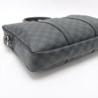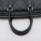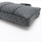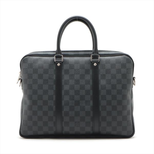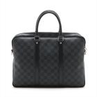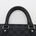 Louis Vuitton Porte-Documents Voyage PM bag in black Damier check coated canvas with leather trim. Featuring rolled leather top handles, silver-tone hardware. The top with zipper closure opens to a black textile lining interior with patched pockets. Approximate dimensions: 36cm(L) x 27cm(H) x 6cm(D), 11.5cm handle drop. Note: shoulder strap NOT included. Accompanied by padlock, keys and a LV dust bag. With Entrupy Certificate of Authenticity. (Pre-owned)